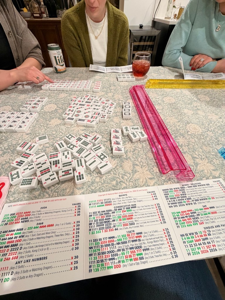 Posted: April 16, 2026 Filed under: Uncategorized Leave a commentI was driving home from my final class of the week — It was a big week — Six classes in six different locations in four days, staying with two different friends two nights. And after my last class I got this photo texted from Carter. Teaching some people to play mah Jongg.