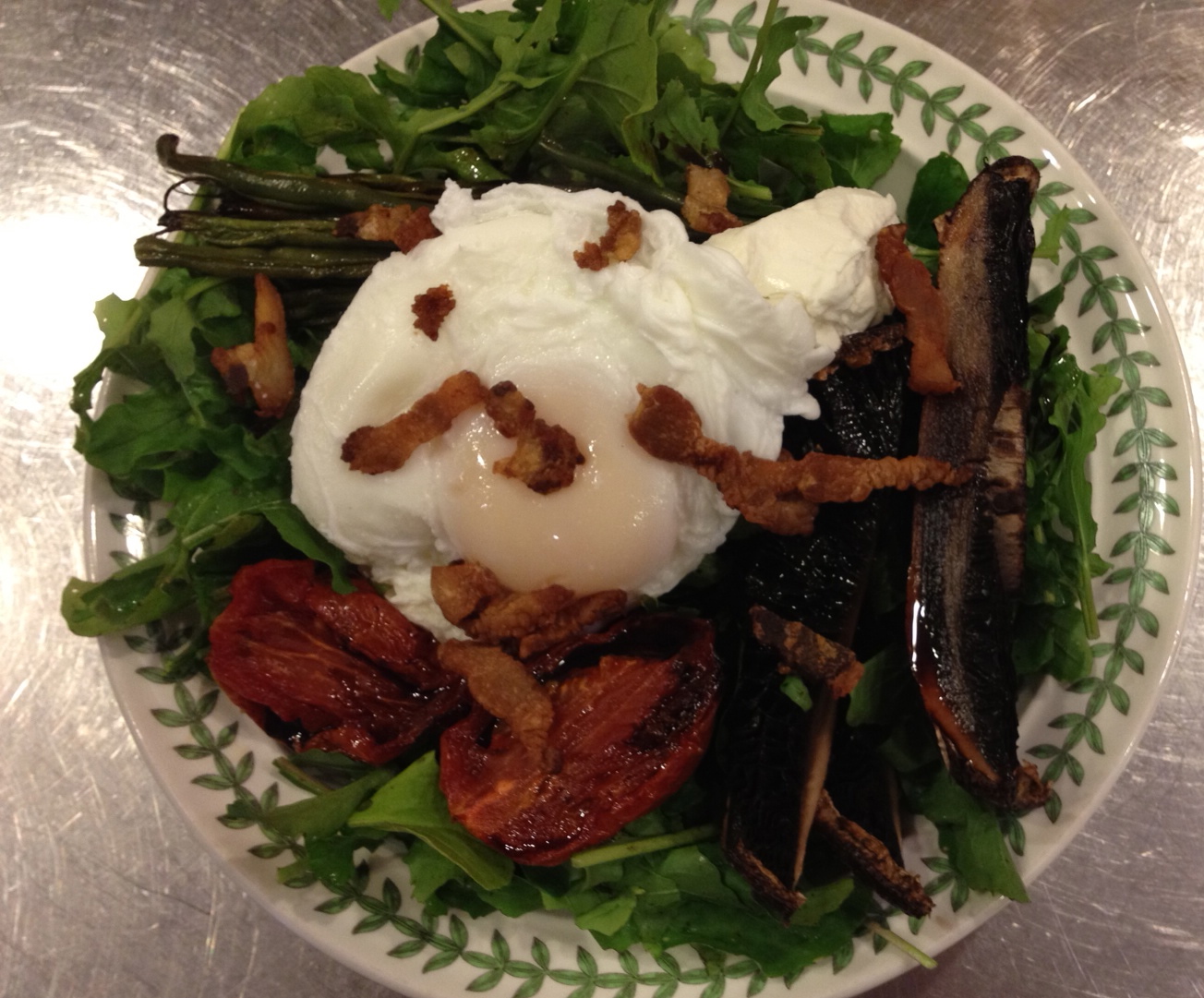 Not many people think of Bacon and eggs on salad, unless it is the mayo laden egg salad.  I like to make a bed of greens with balsamic vinegar and no oil.  The yolk of a poached egg is the perfect replacement for oil.  It gives you the mouth feel of fat, but is still not too unhealthy.