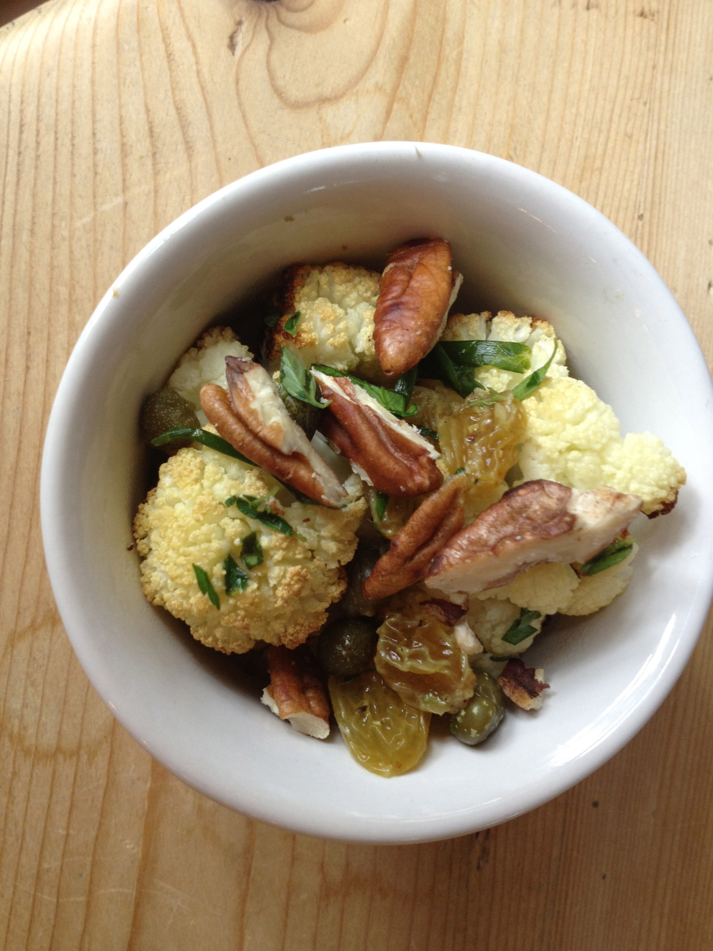 Posted: September 3, 2012 Filed under: Recipes | Tags: capers, cauliflower, pecans, raisins Leave a commentI love cauliflower, but the rest of my family thinks they do not, so I am always attempting to find ways they might change their minds. Unfortunately I made the calorie laden cauliflower au gratin once and so that is the high bar mark for a vegetable they would rather not have at all.