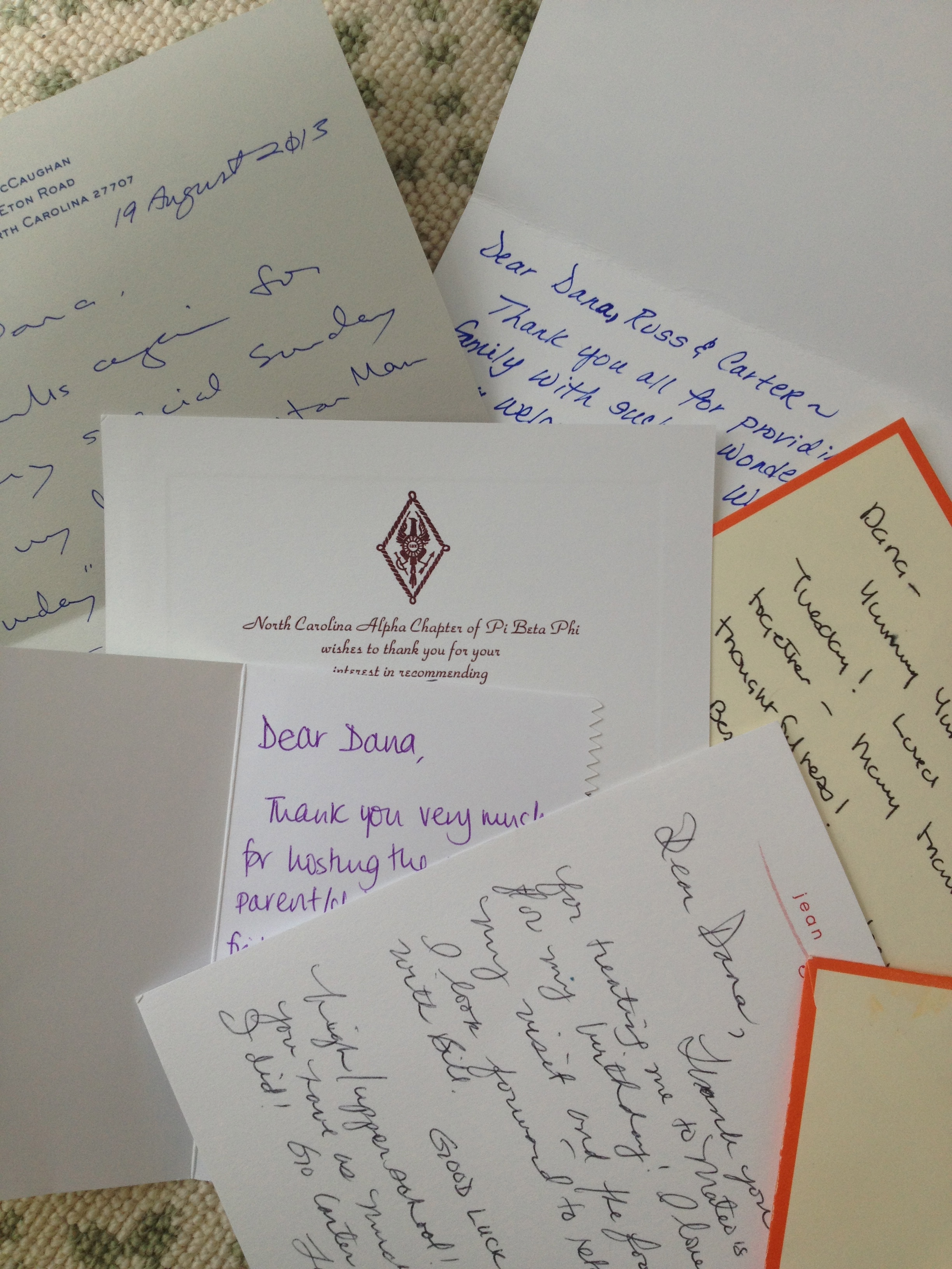 As I began to flip through pile I counted not just a couple, but six real letters. I opened each one to discover they were all thank you notes for five different events. One was a thank you from my sorority for a recommendation, one for a lunch for a friend’s birthday, two for a dinner I hosted, one from a friend at church and the last from a friend I brought lunch to. It was an embarrassment of thanks.