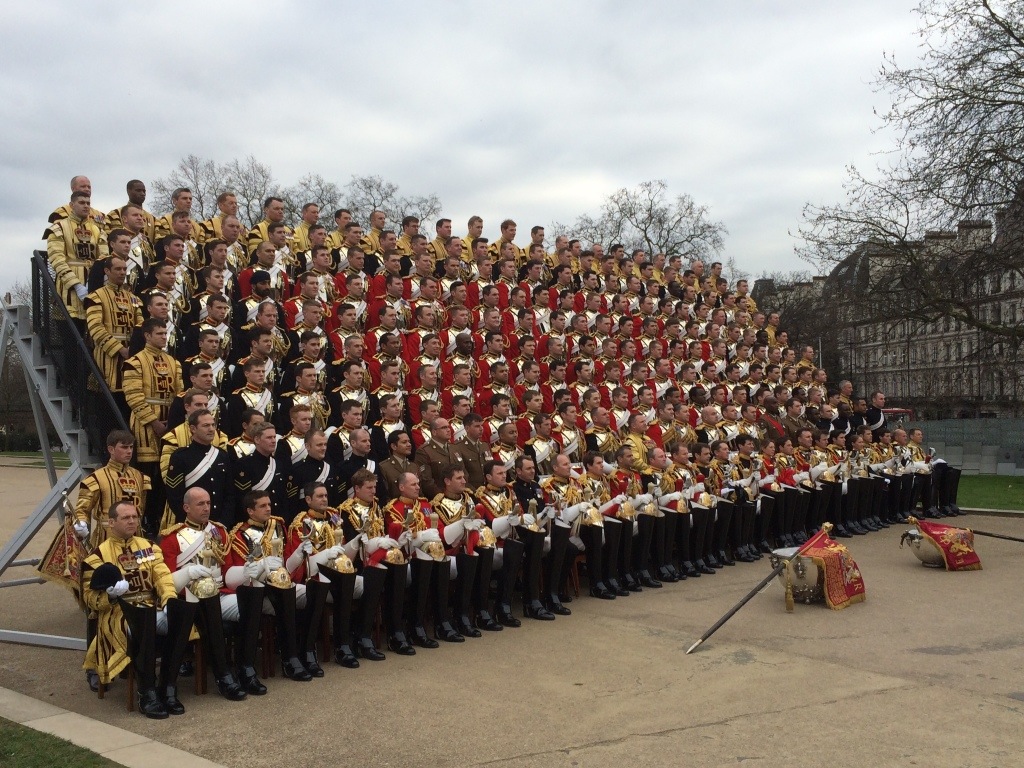 Giving up after a few hours at the museum we walked to the tube. The train car was so crowded that Russ had to stand bent over at a 60 degree angle to fit. This was making me crazy so we got off the tube a stop early and decided to walk home. As we emerged from the underground at Hyde Park Corner we were immediately immersed in a sea of The Household Cavalry in full dress uniforms being lined up on a giant bleachers to have their official portrait taken. It was a sea of attractive young men that made Carter happier than if she had been dropped into the middle of a One Direction concert.