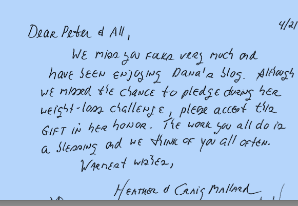 The donation came from Heather and Craig Mallard who live in Delaware. Now before you think I have a greater blog reach than I do, Heather is a friend of mine. She used to live in Raleigh and I first met her when she and I served on the board of the Food Bank in my early days on the board. It was very sad for me as I was coming into my role as board chair two years ago, that Heather, who was chair of the Finance committee, was taking a new job and moving away.