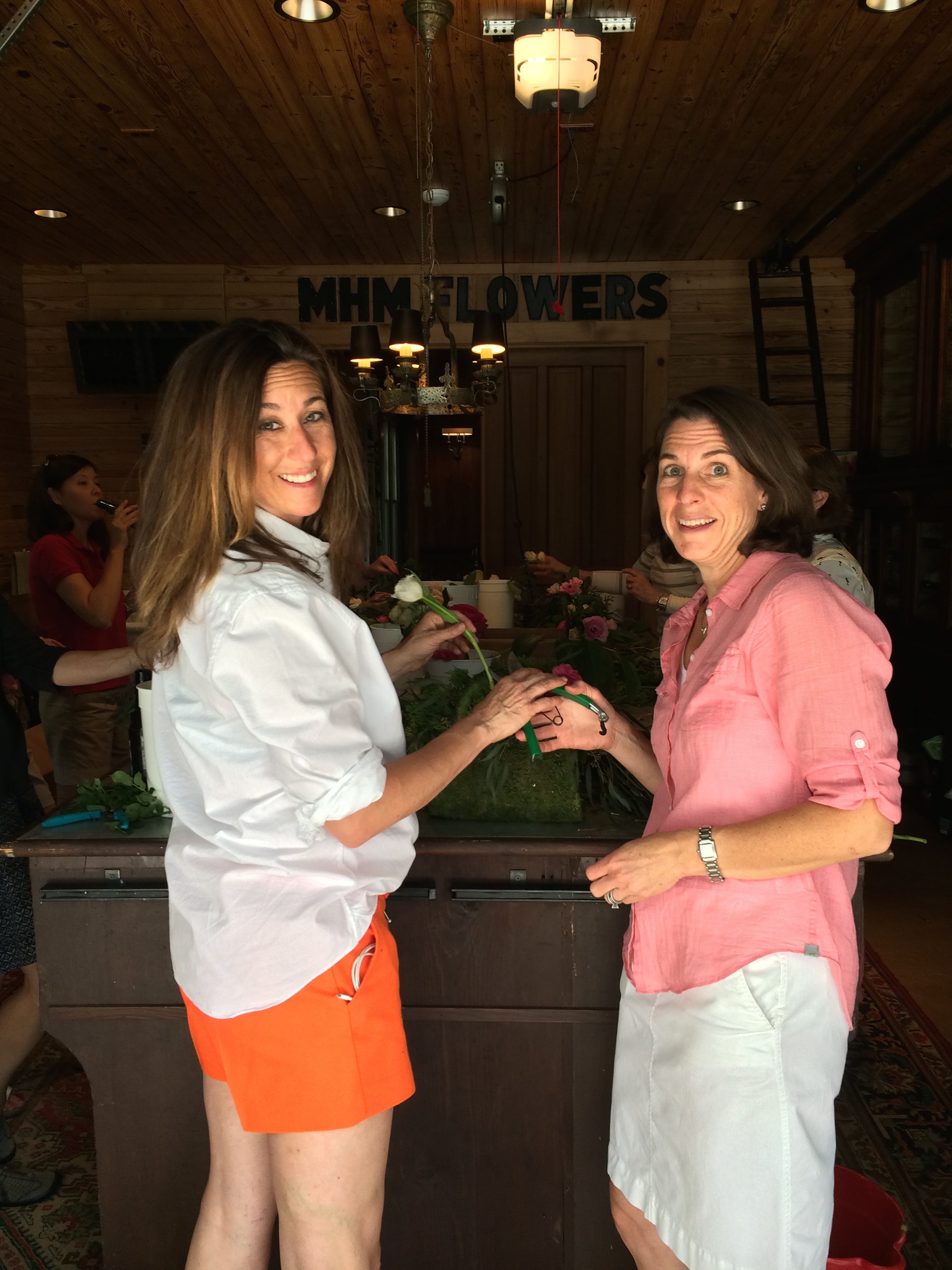 Gathered in this glorious space today were friends who had bought a seat in the class at the Durham Academy Auction. The levels of expertise of the students varied at the start, but with a small tutorial from Morgan you would never have known who was a novice and who was not when we all had created a moss covered pocketbook arrangement.