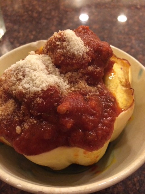 I know that for the last two and a half years there has been very little pasta around here, no homemade meatballs and nary a crust of garlic bread. I too love all those things, but need to steer clear because carbs of those caliber are what got me a hundred pounds fatter in the first place. But why should Russ suffer? So I got to work cooking. I bought myself an acorn squash to use as a bowl for the meatballs and sauce so I could avoid the pasta. Somehow I still feel very bloated.