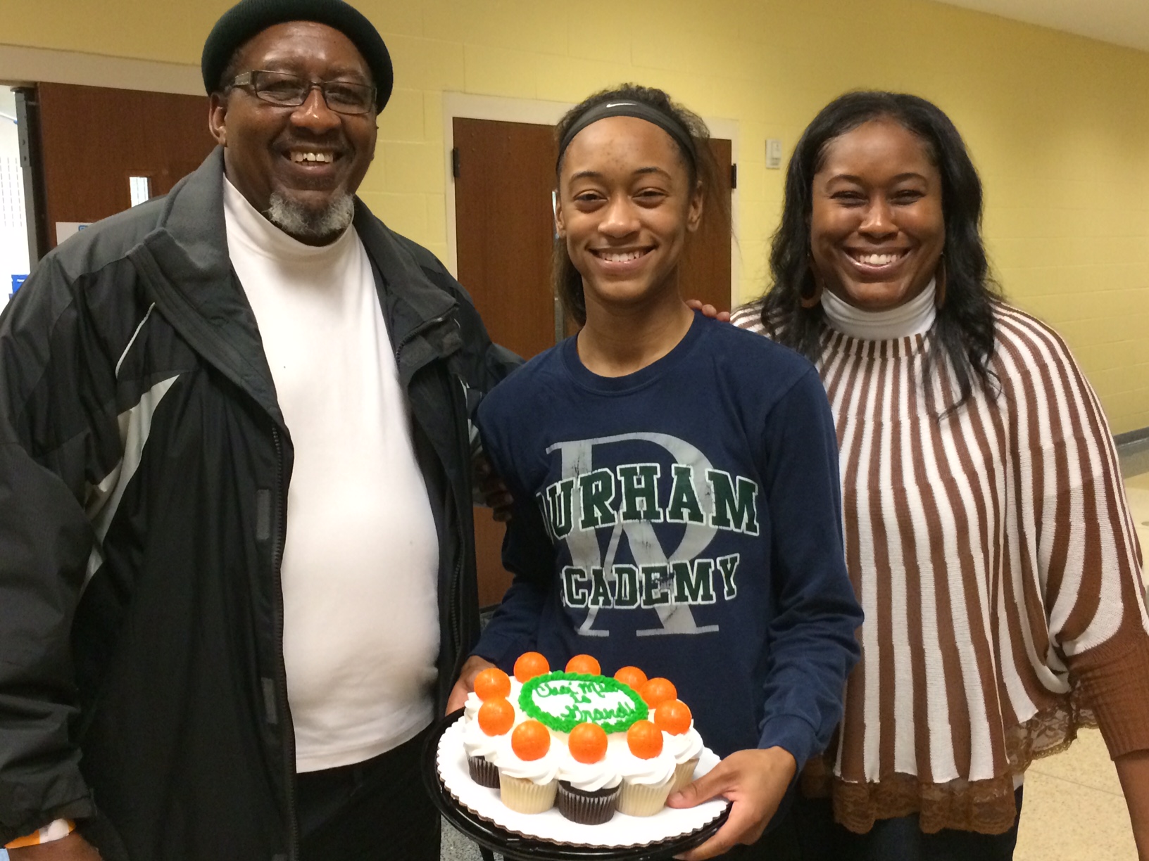 The forth quarter started and all I could think of was whatshisname Physics Professor’s Theorem – down almost double his theory there was no way. But the little team with lots of heart did not know they could not win this game. Slowly they started chipping away at Fayetteville’s lead. Suddenly three’s were being hit and free throws were all being made. With seconds left, Cha’Mia, better known as Cham on the court got us tied up and them closed it down by making a free throw in the very last second. The crowd went wild. My heart was beating so hard it felt as if I had just run a marathon. Fittingly after the game was the planned cake celebration of Cham reaching her 1,000th point in the previous game.