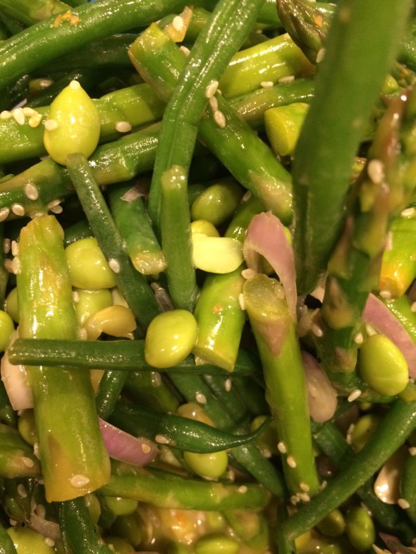 Blanch the asparagus until just tender, about 3 minutes in boiling water and then shock in cold water to stop the cooking. Do the same with the haricot vert, that’s small green beans in case you did not know. Chill the vegetables and add the Edamame and the sesame seeds.