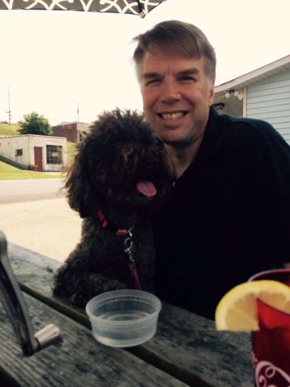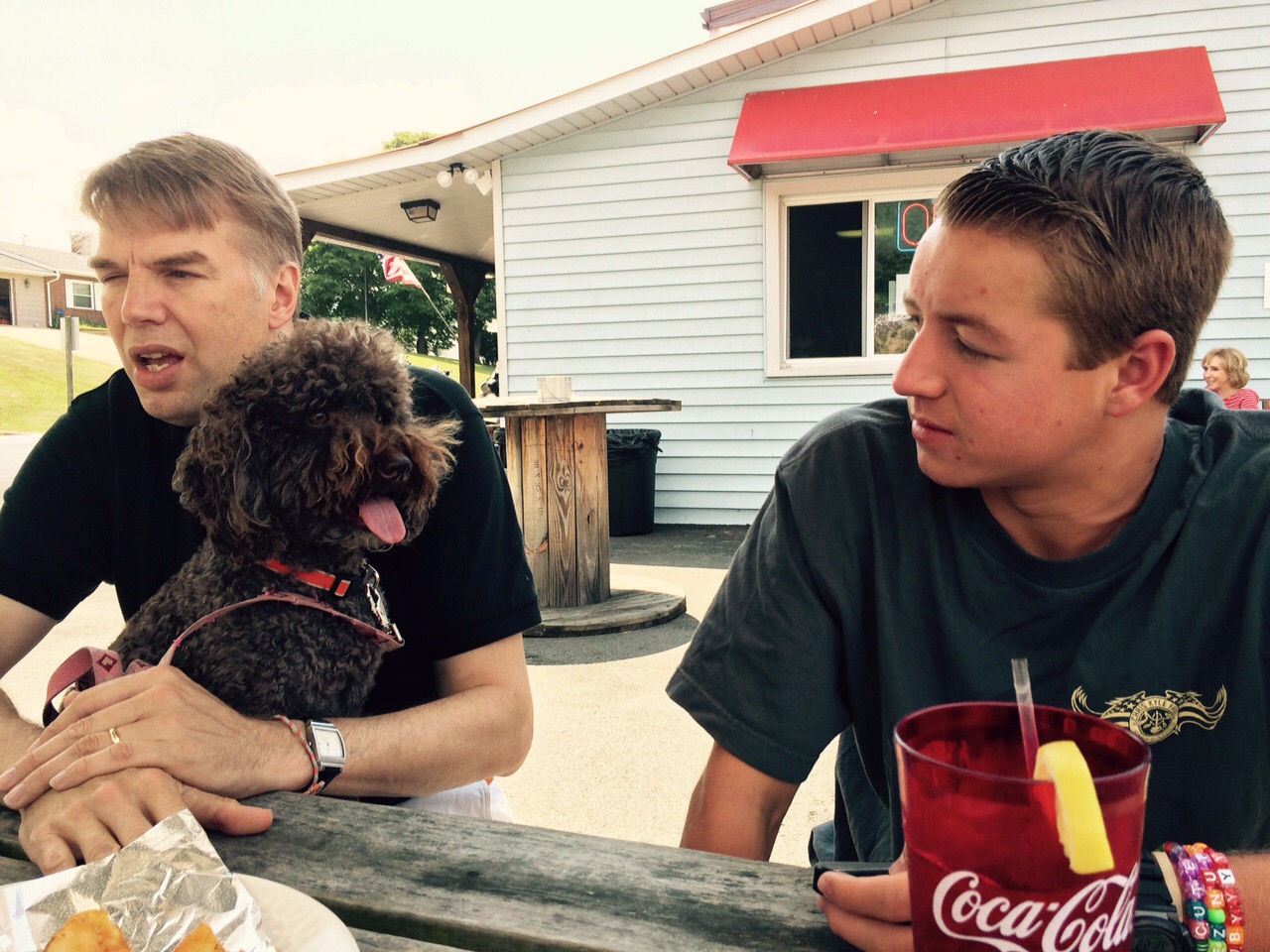 We took Carter and her friend Trey out to lunch. We had to drive on the blue ridge parkway a long distance to get to the biker bar that is the only place with outside seating for me. I don’t like bikers and especially loud Harley’s that the old people ride on. Every time one drove past us I jumped. I did like getting to sit on Daddy’s lap and next to Trey at lunch, especially when Trey gave me his chicken from his salad.