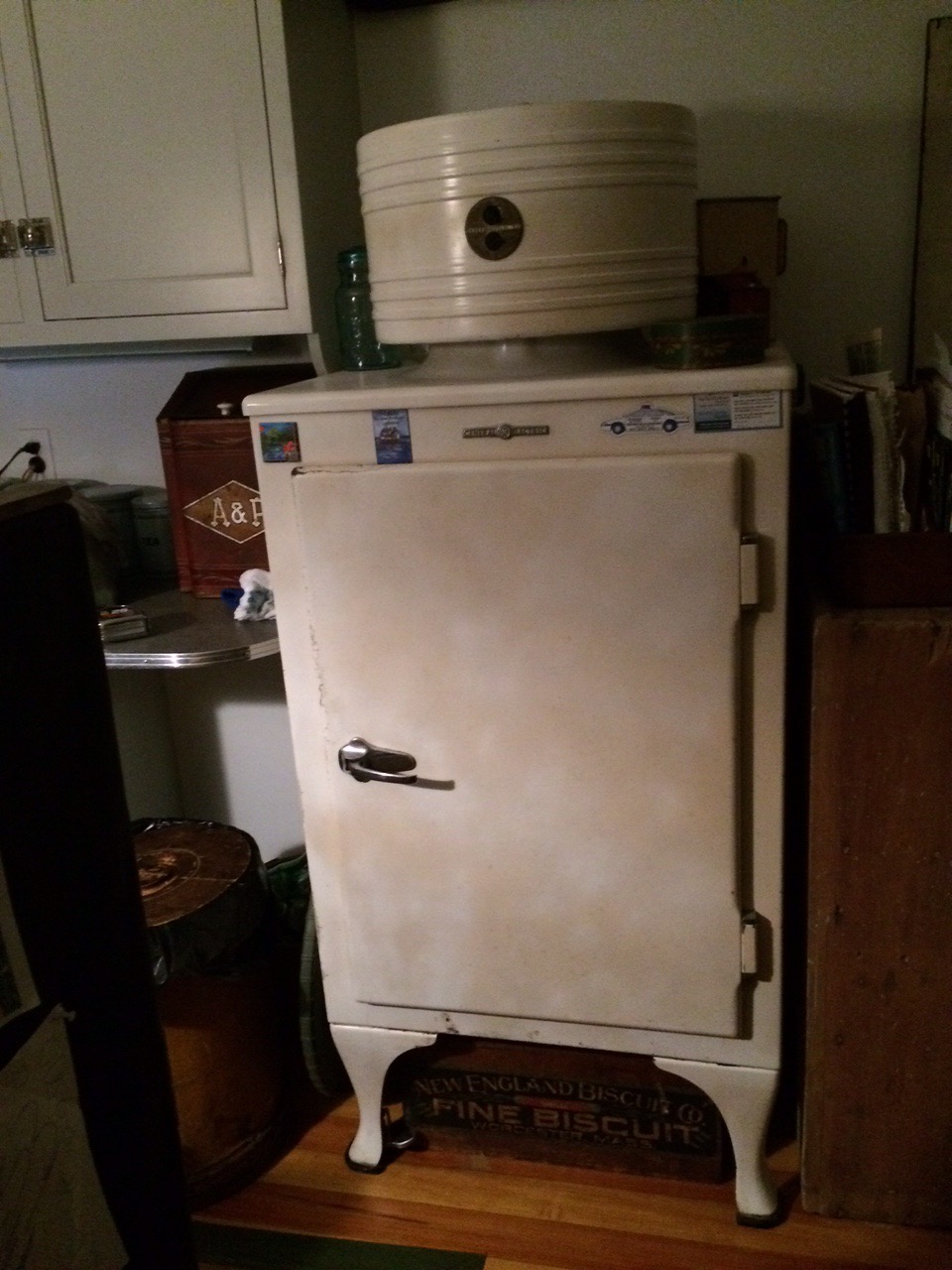 Posted: July 30, 2015 Filed under: Uncategorized Leave a commentThere are two things my friend Warren loves, Howard Johnson’s and antiques. His house is a contrast in styles, the main living space which is full of country, primitive and fine antiques including the kitchen with a 1920’s stove and 1935 General Electric Monitor top refrigerator and the HoJo’s room which has Howard Johnson artifacts from the thirties, through the mid century modern era to the seventies right before the HoJo’s started disappearing. Now many people think Howard Johnson’s is an antique given that there are only two HoJo restaurants left in America, one is Lake George, NY and the second in Bangor, Maine.