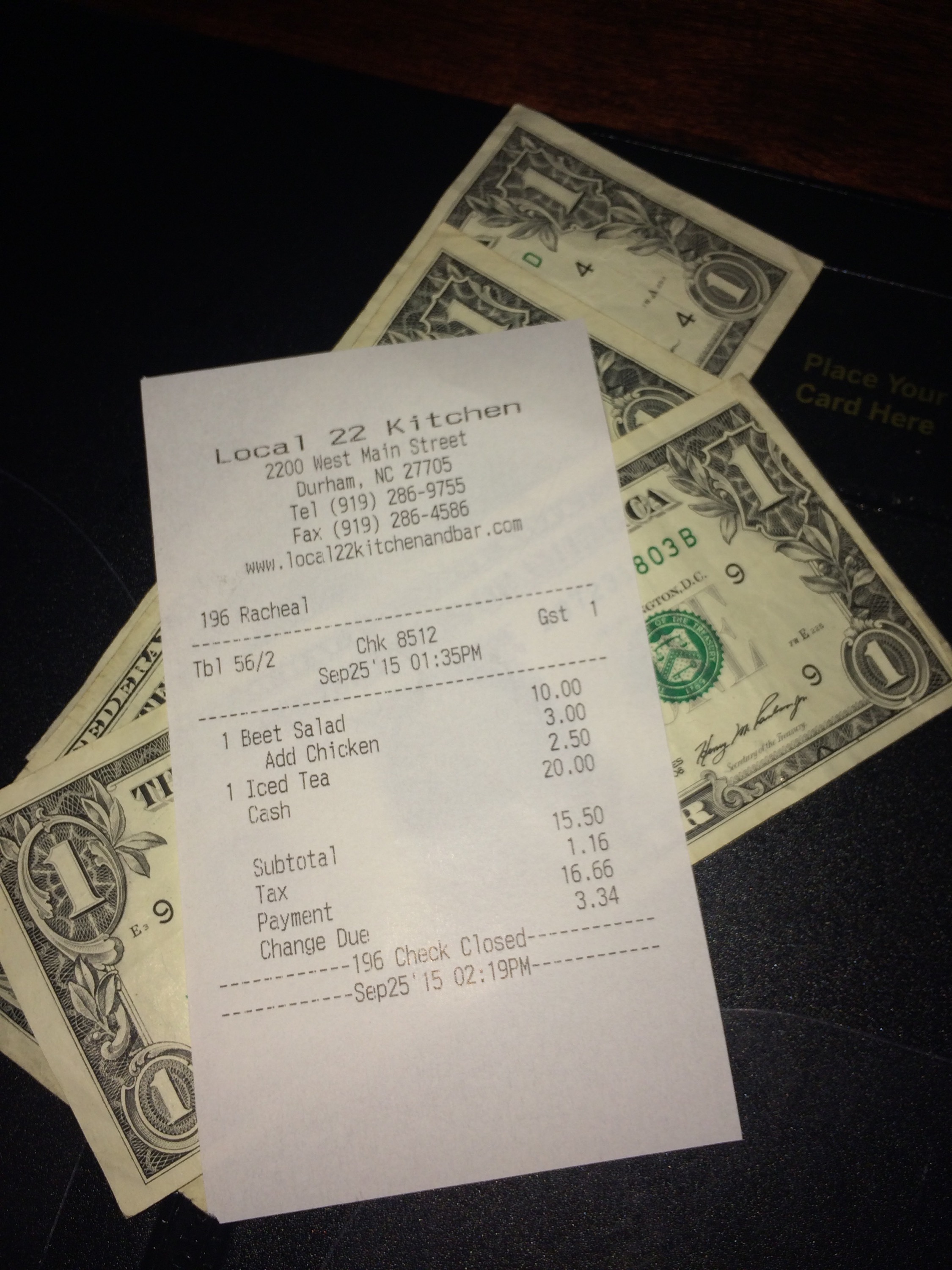 We had to ask for tea refills which took forever as did the change giving from the check. Being the queen of cash I put a twenty in my check folder. Eventually she came back and brought my change. Interestingly even though the ticket said the change was $3.34 she only gave back three ones. I was planning on leaving all the change for a tip, since I feel like restaurant workers are underpaid, but I thought it was quite presumptuous of her to not return the coins. She might not have even made the change, but she certainly did not care enough to check. Really being a waitress is not the right job for her, or perhaps she had just had a terrible run in with an insurance company customer service supervisor.
