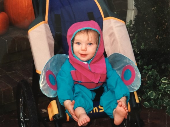 When Carter came around I used her as my costume model. Thinking up and making costumes was something I did for months before Halloween. For Carter’s first Halloween as a non-walker I made her a dragon fly costume which was comfy enough to wear in the jogging stroller. Her second Halloween she was a garden, a soft sculpture version that she wore like a smock, her third year a scrapbook made out of cloth with real photos of her life printed on the material.