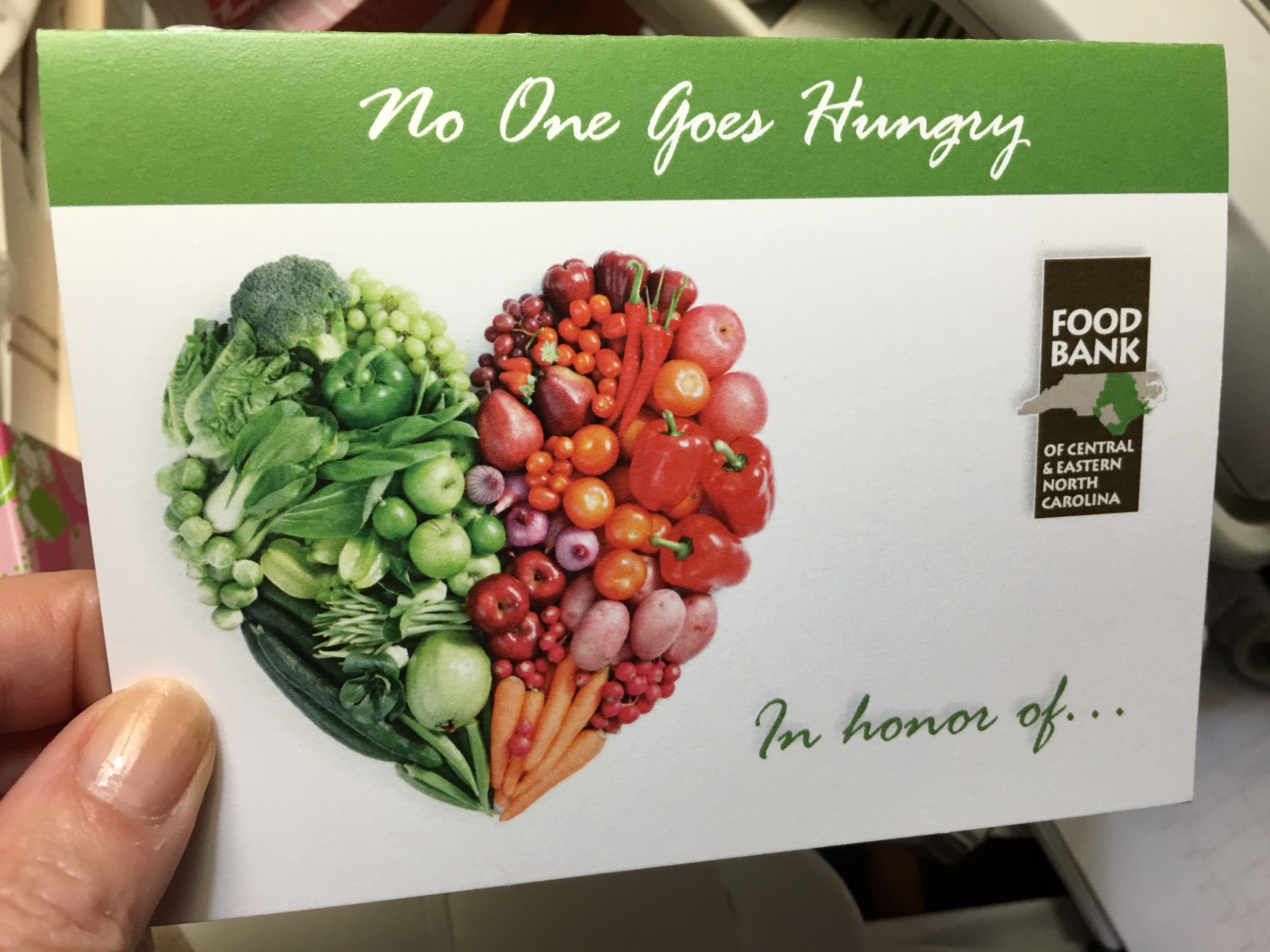 Today I had the nicest surprise in the mail. A card from the Food Bank announcing a generous gift in my honor from my friends Shelayne and Frank. It came as a complete surprise since I did not solicit them. I should have not been surprised at all since it is not the first time they have spontaneously given to the Food Bank in my honor, but they never give me any warning or heads up, just quietly give.