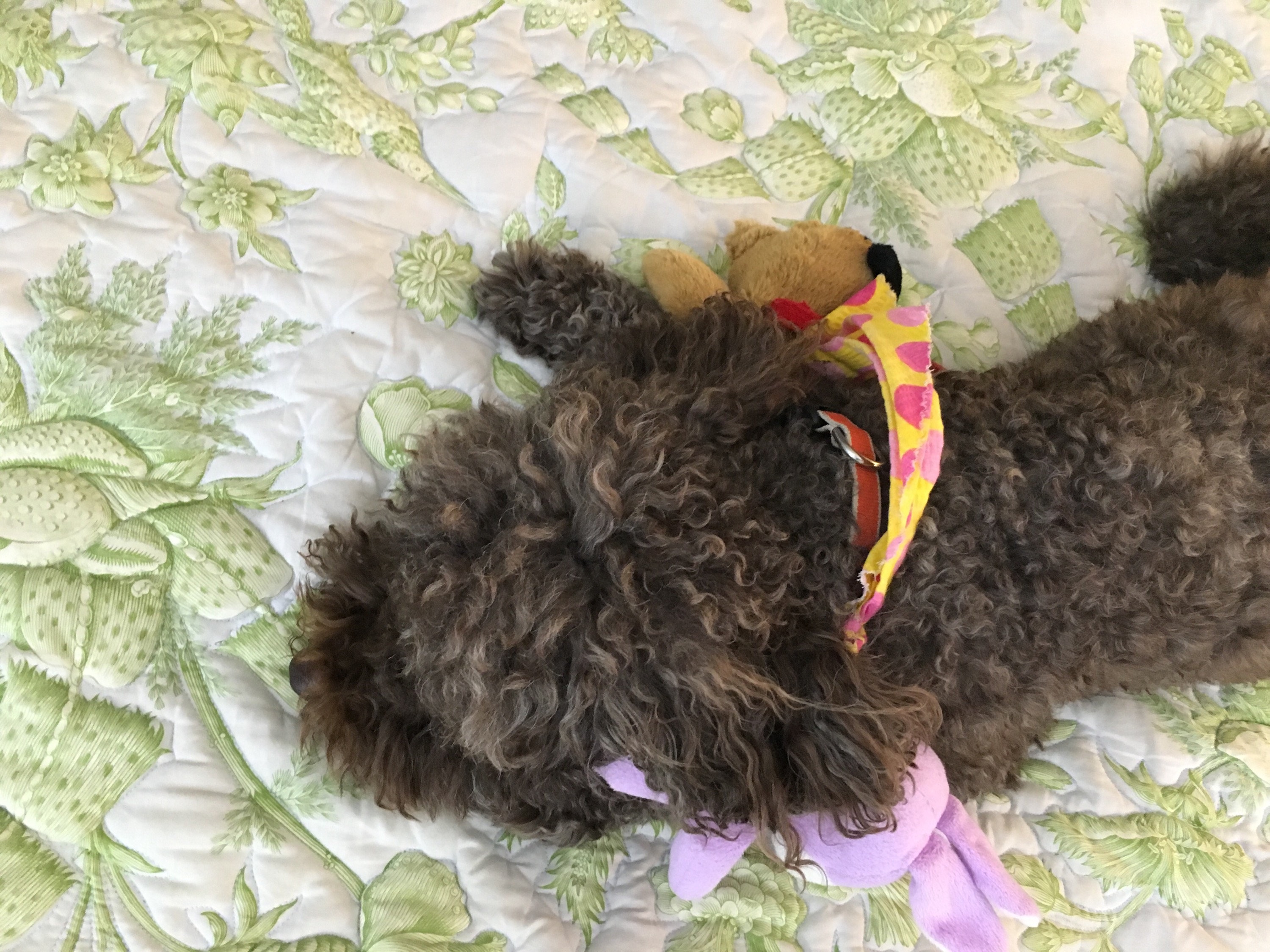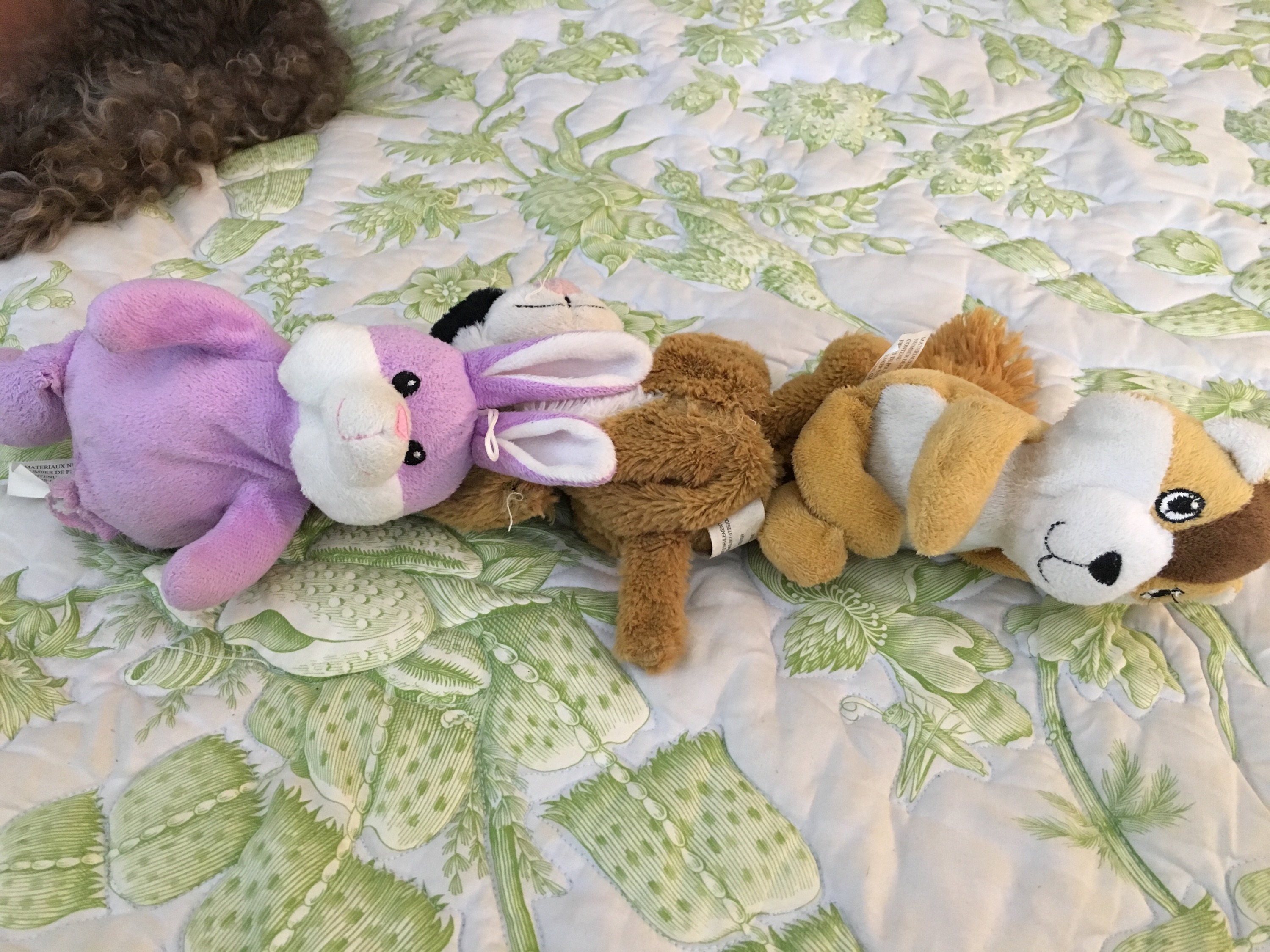 Today she seemed a little better, but not totally back to herself. I came up to my room after dinner and found Shay still sleeping on my bed, but now a third lovey from the sunroom had joined her other two. They were all placed out in a line next to her.