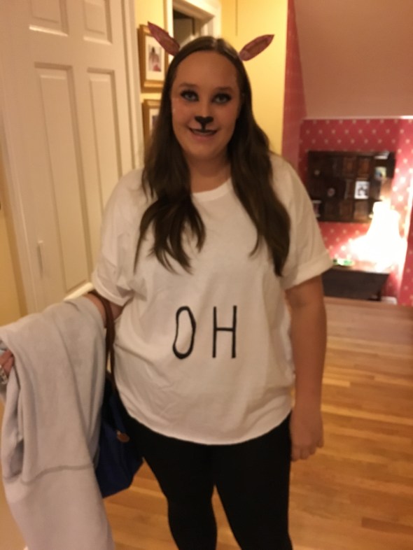 The years of my having any say in her costumes is long past. This year she has had two, a school girl with her friends and “Oh dear.” With her face made up as a deer and a shirt that says OH on it. It is much better than the combination I would have come up with for a shirt that said, “OH.” Of course I don’t know how to make an “OH S#%?” costume.