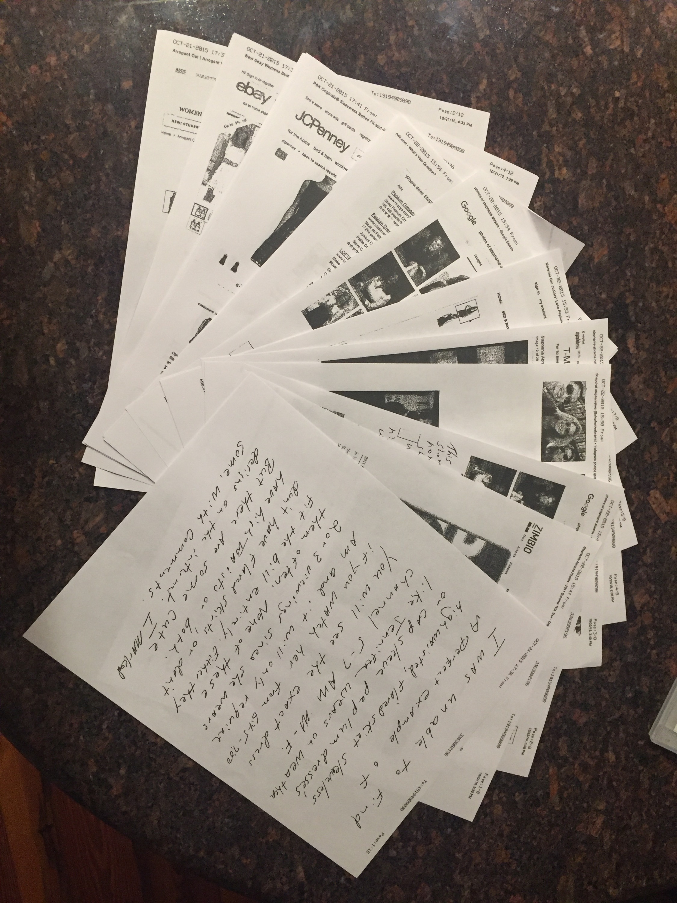 The cover page handwritten letter encouraged me to get up early on a weekday and watch the weather channel since this woman is only on the air from five AM until seven. Already this is a project I am not interested in. My Dad goes on to explain that he thinks she has a similar body to Carter and she wears a style of clothing that is very flattering. Since he was unsure what the style was called he researched all the web to find other people who were writing about her clothing and found words describing her dresses. Then he used those words to search for dresses for sale on the Internet and found at least twenty that fit the style he was looking for.