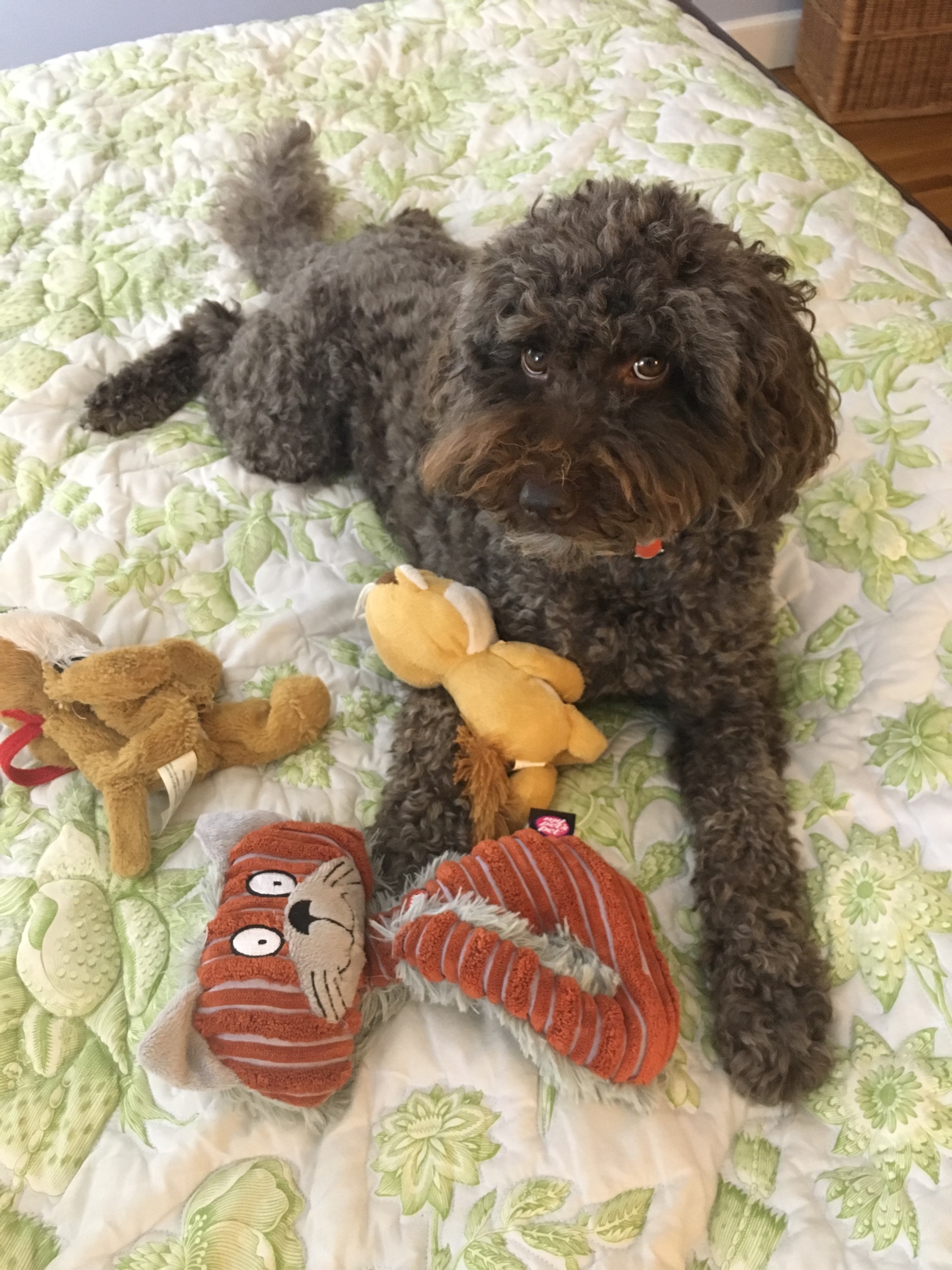 As I entered the bedroom Shay looked up at me with a guilty sort of look. Now, long ago we gave up on any idea of keep Shay off the furniture, so being on the bed as not a reason to look guilty. I looked at her surrounded by various stuffed toys, some without an arm or leg, most certainly without a squeaker. I looked a little closer and notice a pice tag off to the side and upon further investigation noticed that one of the toys she had was a brand new I had just purchased for Christmas.