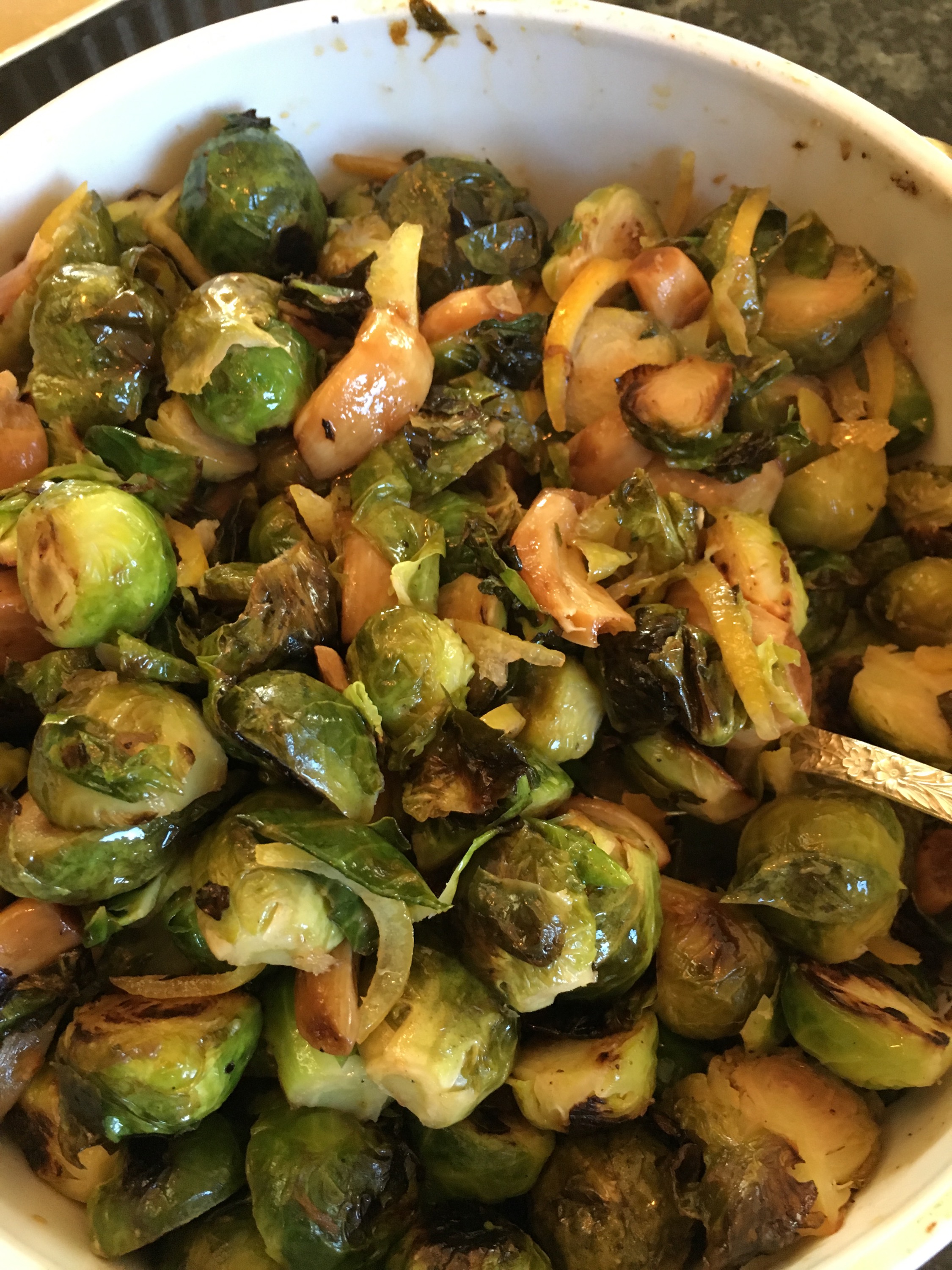 Roast Brussels Sprouts with Caramelized Garlic and Candied Lemon Peel