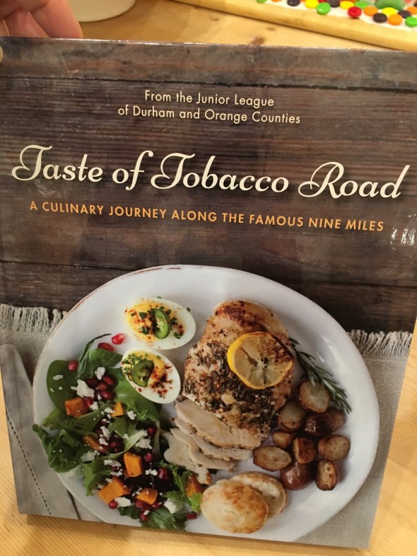 The birth of a cookbook is a long gestation and I think I heard this was a four year project. The work shows in the book, perfectly titled Taste of Tobacco Road. Unlike Junior League of the past this book has many original photos that were shot at Sarah’s mom Sally’s house. But true to league cookbook traditions the book is full of friendly, recognizable favorites of the area like tomato pie and two kinds of pimento cheese. Items any southern cook should know how to make by heart, but a recipe never hurts.