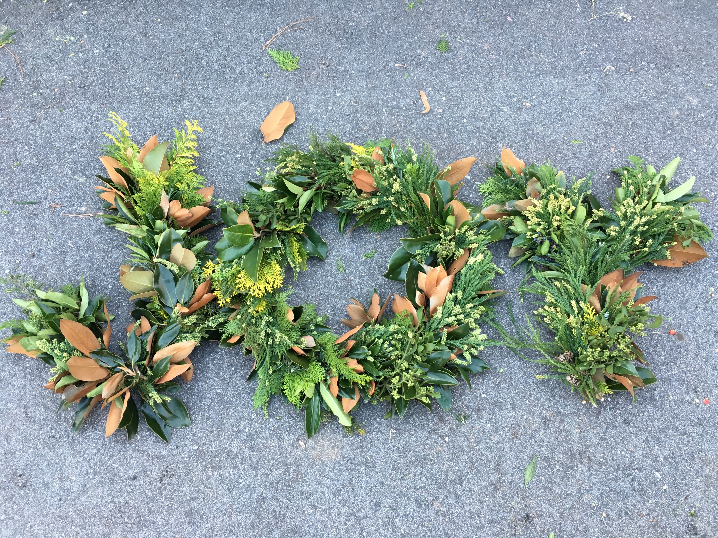 This year I was a little late for the party because of a basketball game, but I was determined to make my wreath before I went into bow making mode. It was a big square of greenery with a flannel tartan bow. I was late enough that many people were forced to learn to tie their own bows, which were all perfectly gorgeous. I only made about a dozen ribbon creations for other late wreath makers. In the end one of the best creations was a trio of wreaths that spelled out “JOY” with no bows at all.
