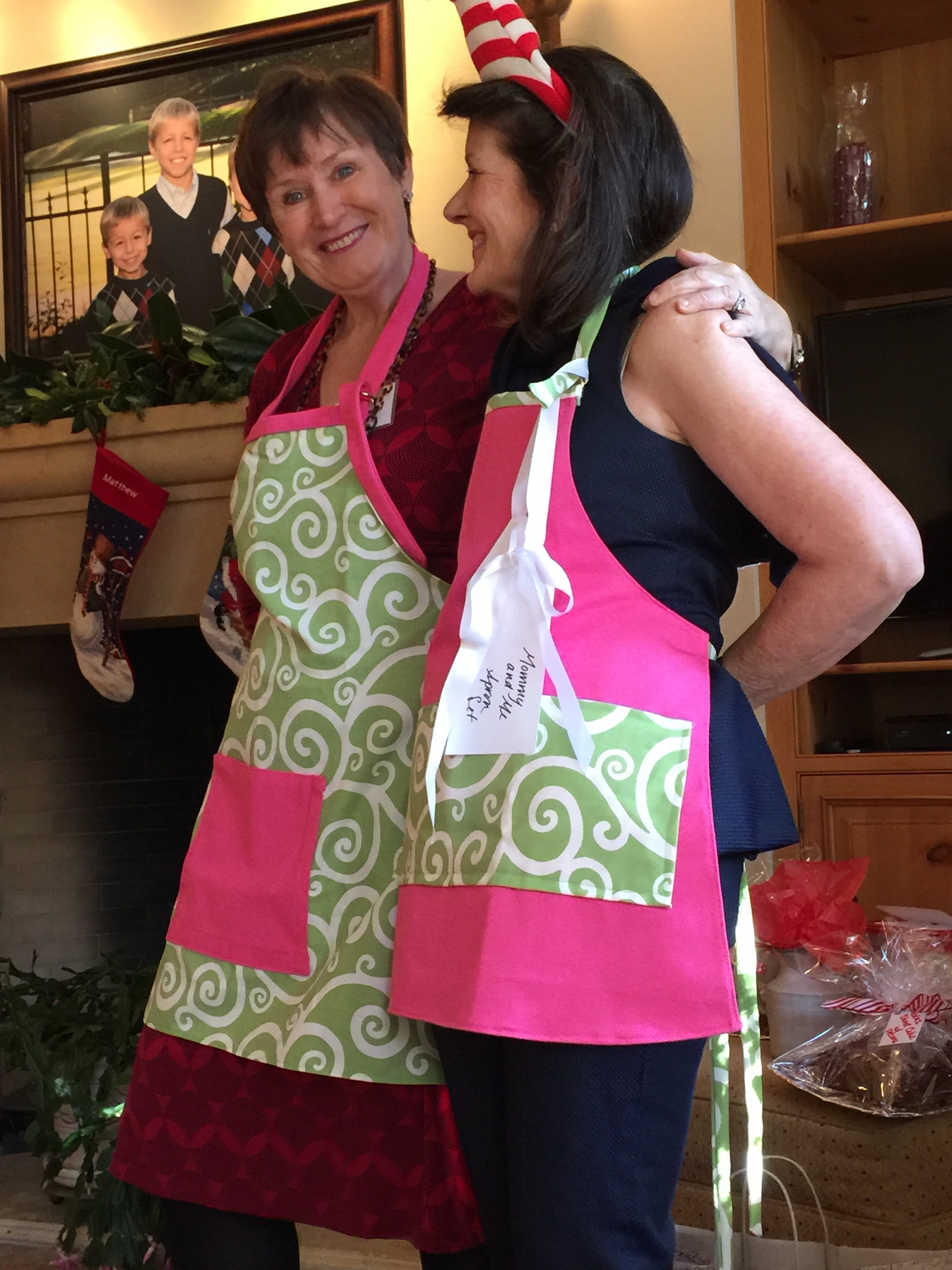 I could never do this job without the help of the runner elves who bring me the items so we can keep the pace up. Thanks to Kathi Eason and Connie Kearny for being the elves. Kathi is also a good model and is seen in the picture with me modeling the mother daughter aprons, made by Stephanie Perun. Of course, I am playing the mother in this scenario.
