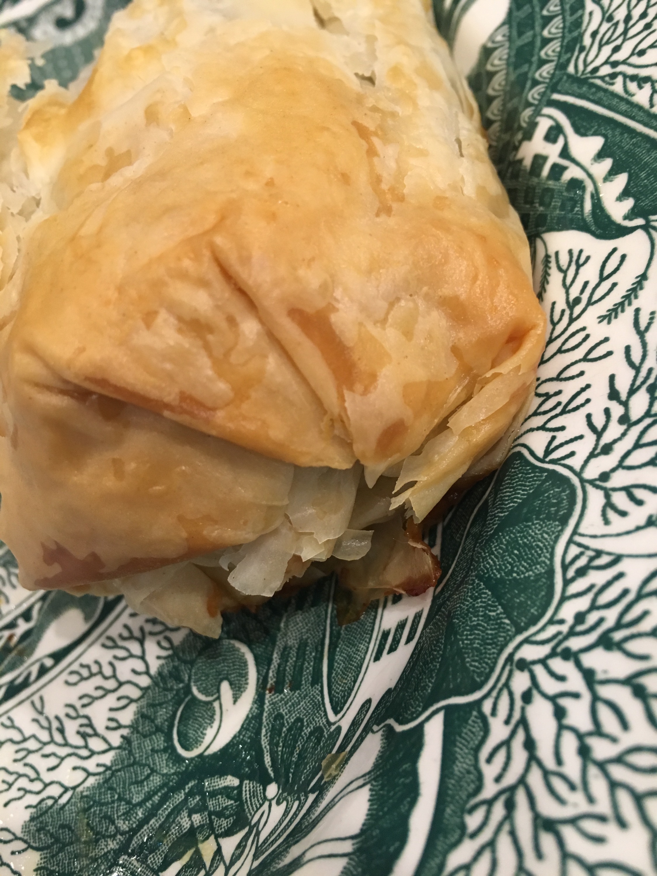 Spoon one sixth of the filling onto one end of the short side of the filo dough making sure it is about one inch in from the edges. It should be a log about two inches wide. Fold up the short side on the end of the log and start rolling it up folding in the sides as you roll. It should look something like a big egg roll. Brush the outside with butter. I like to wrap each strudel in a separate piece of foil and freeze them individually if I am not baking them immediately.
