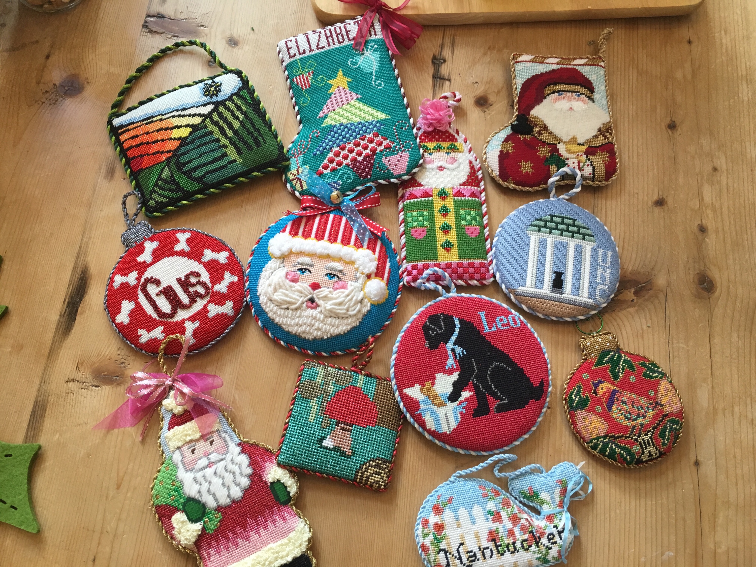 Today kicked off my holiday entertaining with my favorite thing, a lunch where everyone can fit around one table. I had my multi-generation needlepoint ornament exchange lunch. This is no last minute pot luck. My group of stitching advisors pick names in January that we keep secret all year. Each guest makes a needlepoint Christmas ornament for her special person. It is quite a lot of pressure for me to come up with a project worthy of these superior stitchers.