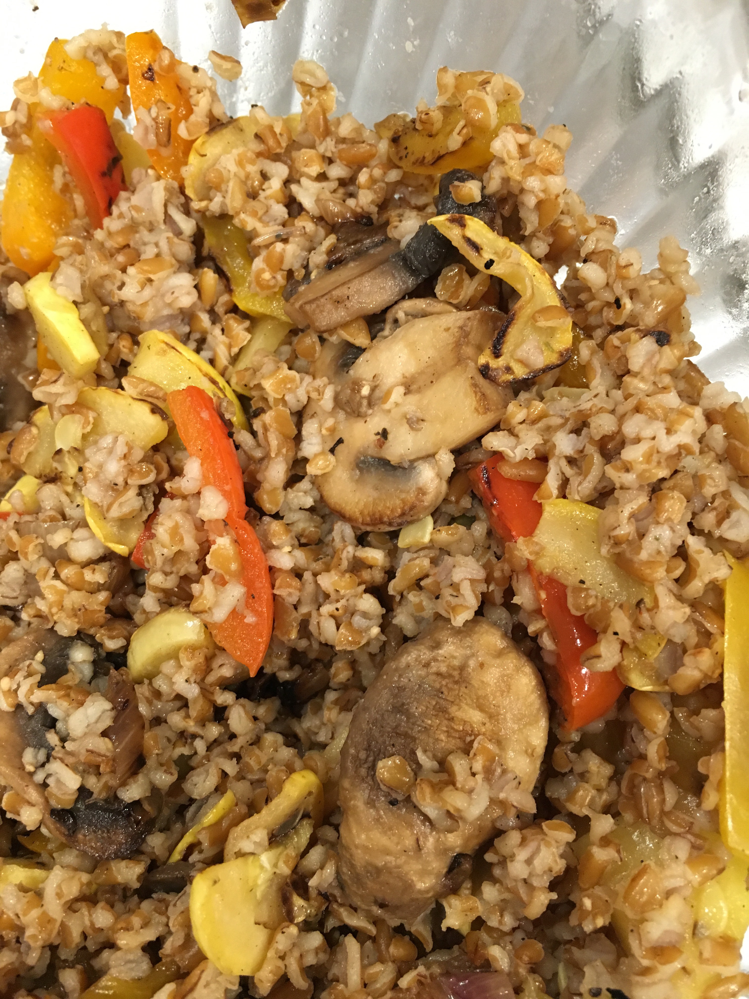In a fry pan sprayed with Pam, sautéed the squash and season with salt and pepper. You need only cook it a minute or two depending on how big you have chopped it. Once cooked place in a bowl big enough to hold the whole dish when done. Spray more Pam and add the shallots and cook for 30 seconds, then add the peppers and the mushrooms and continue cooking until they are done, about three minutes. Salt and pepper when done. Put those vegetables In the bowl with the squash and add the cooked bulgar and the oil and vinegar.