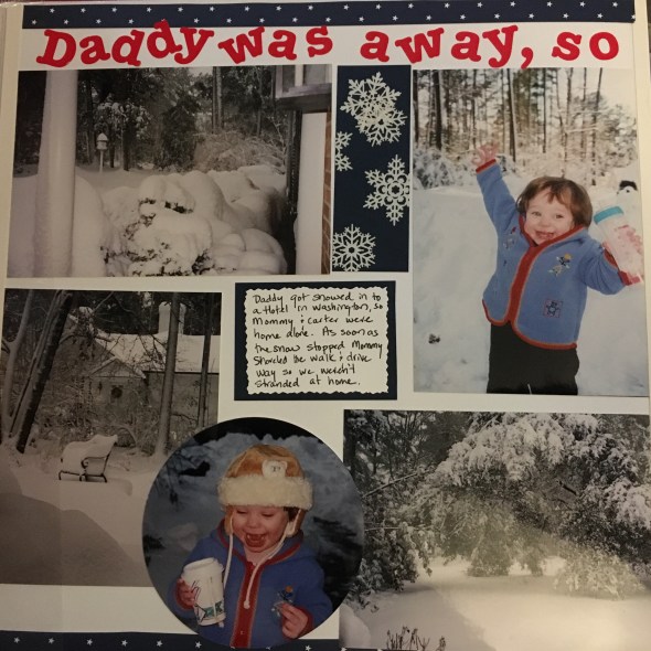 According to my scrapbooks Russ missed a number of snows in a row when Carter was two. I remember that the first night without power I threw a heavy duty extension cord out the window of my bedroom and plugged it into the power inverter in my jeep, not to run a heater or lights, but to power the TV since it was the final episode of Survivor. If Russ had been home I probably would not have wanted to watch TV, but if Russ were home it probably would not have snowed so much.