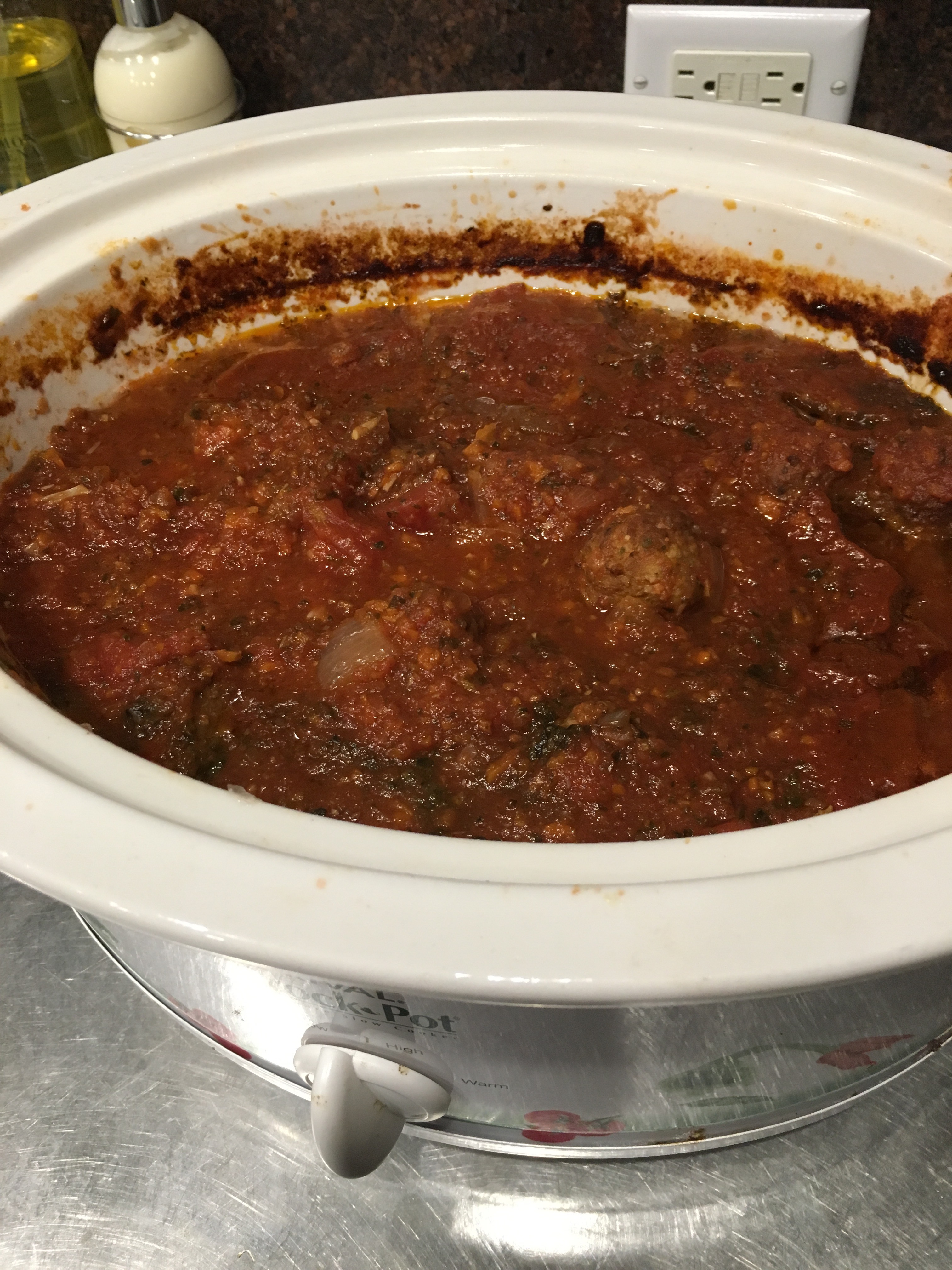 Today I had a Food Bank meeting in Raleigh in the middle of the day, came home for a conference call and then went back to North Raleigh for a basketball game. With all that coming and going and a low stock of leftovers after snow bound eating at home, I decided today was the perfect day to try the crockpot. I looked in my pantry of rarely used items and knew that I could make a tomato sauce with the carrots and onions I had fresh, and canned tomatoes. I also knew there were frozen meatballs that could be added later so I thought I’d try it.