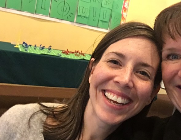 Taylor had set a goal of $3,000 to raise for summer mission trips. I secretly was worried about reaching that goal with 14 sweet items, but I did not tell Taylor that. The auction had a football theme given that it is Super Bowl Sunday. Taylor make a football field on the front wall of the fellowship hall. High school senior, Jack High was my Vanna White to model the cakes as they were auctioned and to fill in the football field in as we reached each $300 down on the field to get to $3,000.