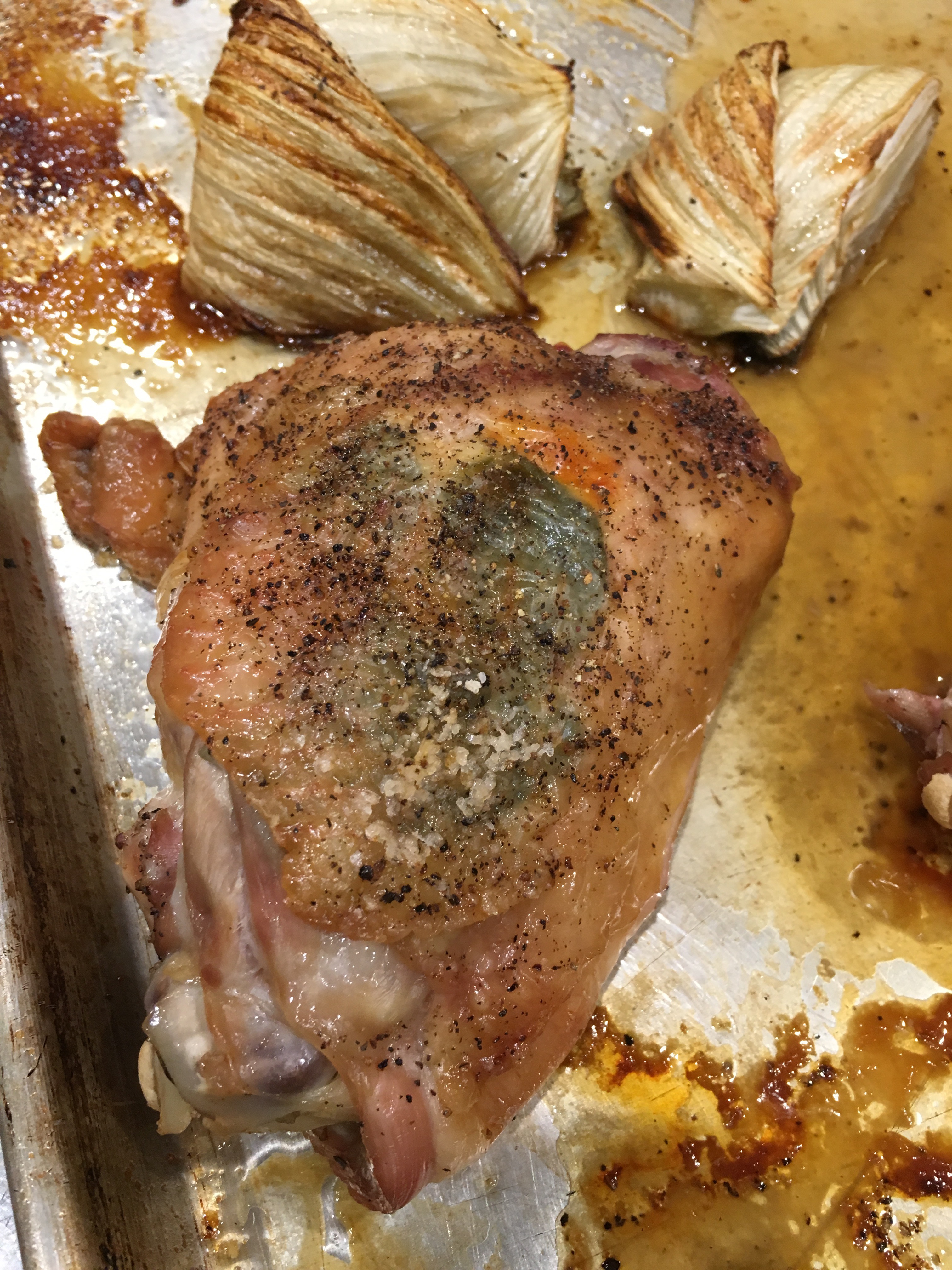 Spray a jelly roll pan with Pam and place the thighs on the pan. Don’t use a pan with sides any higher than one inch because you want the heat to circulate and crisp the skin. I also quarter 2 fennel bulbs and put them on the pan to roost with the turkey at the same time.