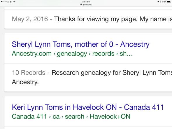 Posted: July 21, 2016 Filed under: Uncategorized Leave a commentYesterday I was with my friend Lynn Toms and we were googling her to see if we could find something. Today I can’t even remember what we were looking for, but I do remember something we found about someone named Sheryl Lynn Toms. The Google listing was for a ancestry.com site and it said “Sheryl Lynn Toms, mother of 0.” What?!