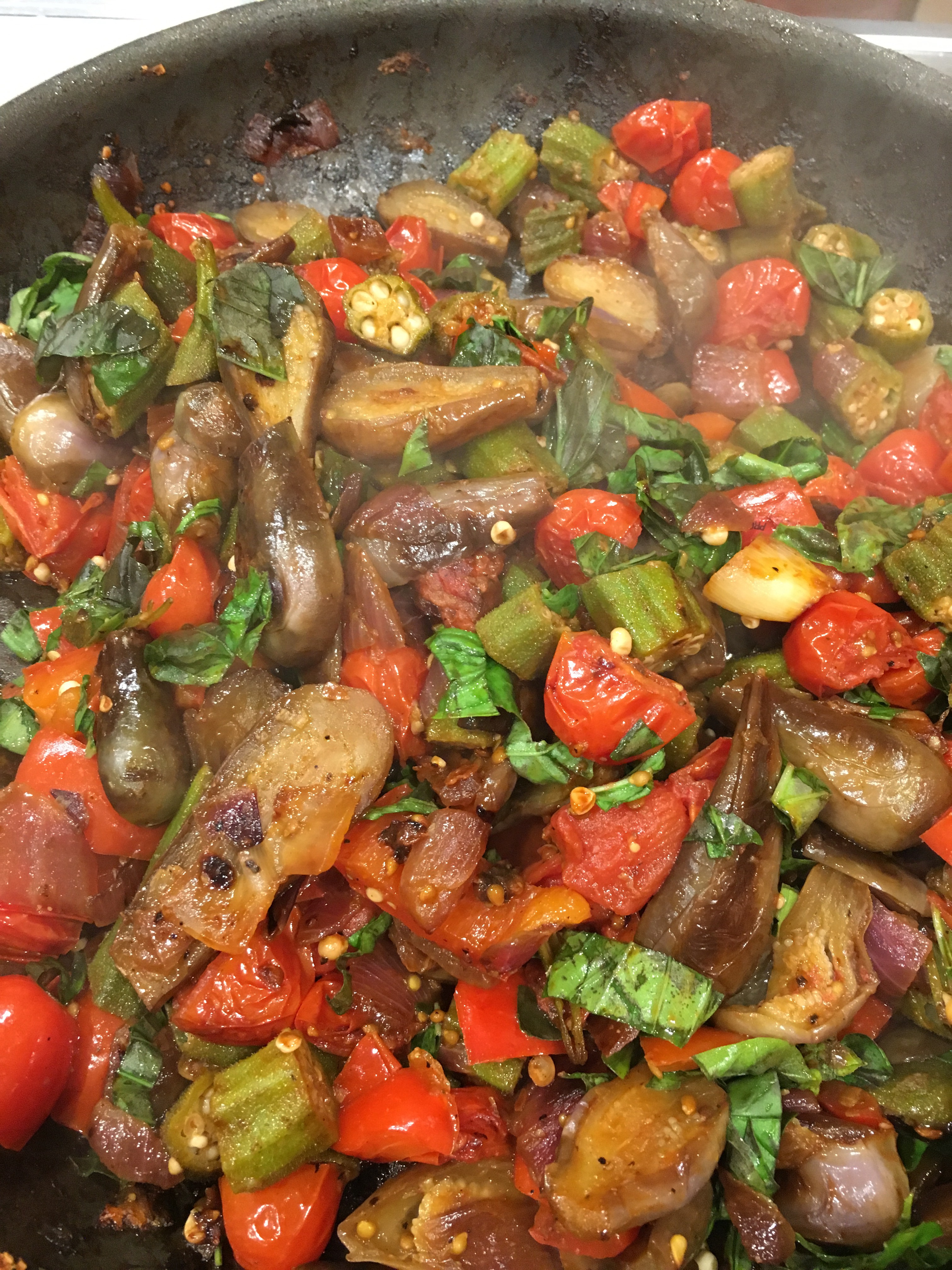 Heat a big nonstick fry pan on medium high and spray with cooking spray. Add the onions and cook for two minutes, tossing it twice. Add the eggplant and spray with a little more cooking spray. Cook for two more minutes – stirring only once. Add the okra and cook for three more minutes, stirring once a minute. Add the red pepper cook another two minutes.