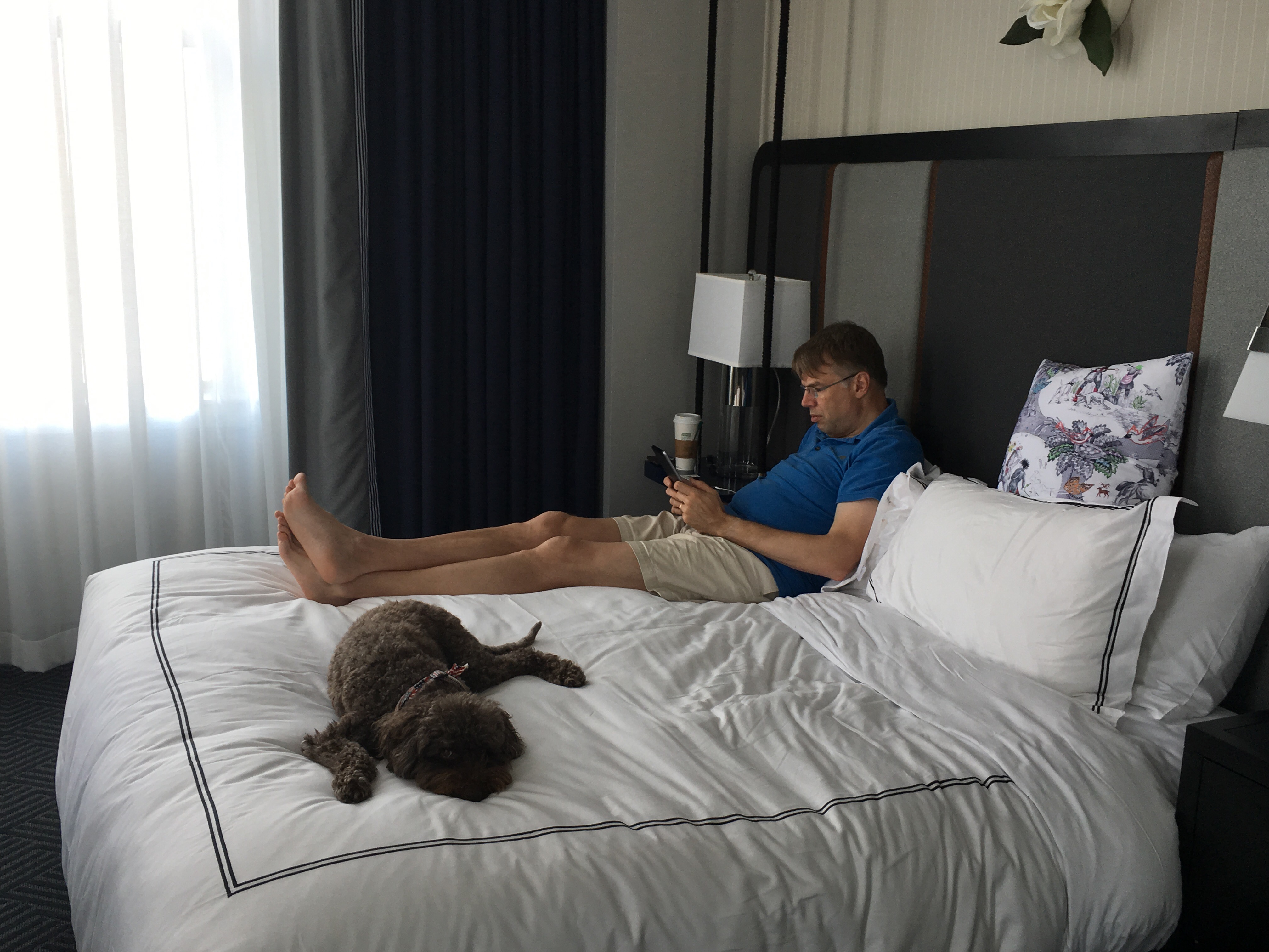 As far as I am concerned this is a much better trip than going to California. Thanks to Russ being a superior Kimpton customer we have a giant suite that Shay is having a blast in and Carter has her own lovely room right next door. Shay thinks coming to stay at hotels where lots of people bring their dogs is way fun. There are dog treats, and water bowls and even special dog beds if you want one. Shay of course says, “Beds, that is what I have with Daddy right now. Why would I sleep any place else.”
