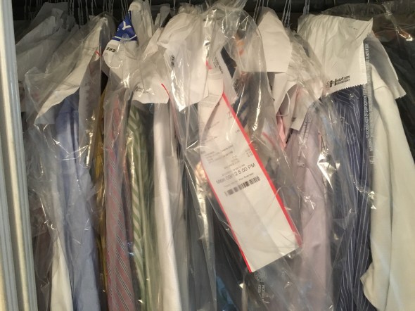Russ had no trouble adapting to this new found embarrassment of shirt riches. Going to the laundry is one of his favorite chores. He has even trained Shay to love to go with him when he drops or picks up his shirts because they give her a dog bone there. Shay does not like to eat the dog bone, but she still wants to go to the laundry.