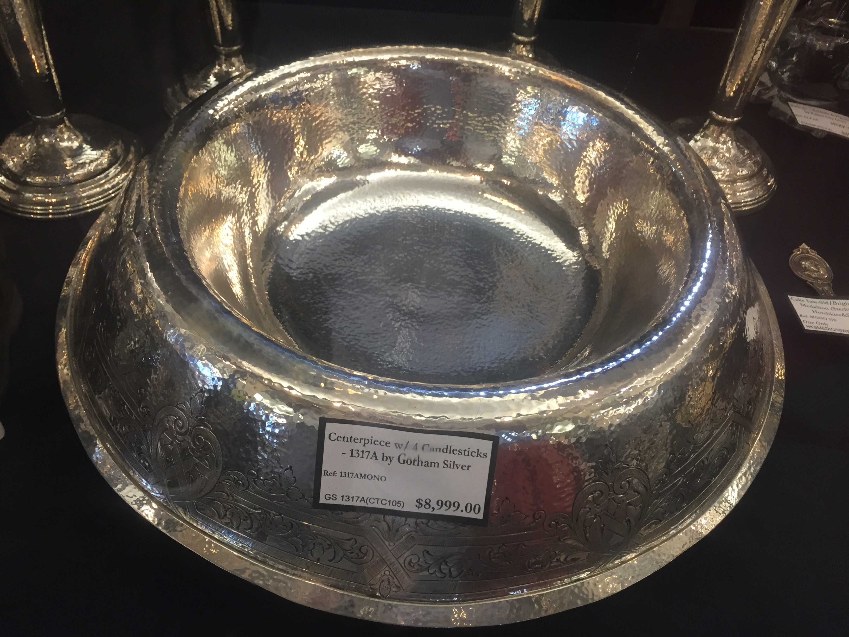 The silver was my favorite section. The incredible narrow uses of a things like the asparagus serving tray with a pierced piece to set the green spears on so that they would not sit in water and get soggy seemed beautiful, but not an everyday item. There was one big ass dog bowl that was at least 14 inches across that could be used everyday. Of course it was not listed as a dog bowl, but a center piece with four candle sticks. At just under $9,000 I guess your dog would get to stand on the table and eat their food from that silver bowl. The candle light is just a nice added touch for the dog that has everything.