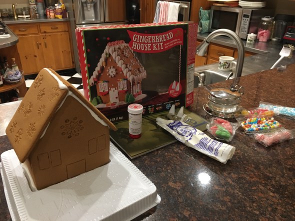 True to her toddler days I had something on hand that fit the bill, a ginger bread house kit. She thought that was a grand idea and went to work assembling the premade cookie walls. While we were waiting for it to harden before decorating could begin we played two games of Sorry. I can fully attest that no thinking whatsoever goes on during Sorry. After she won a game she felt it was time to decorate. A roof and one wall and she was already tired of that craft. “Can I finish it tomorrow?” Just like when she was two.
