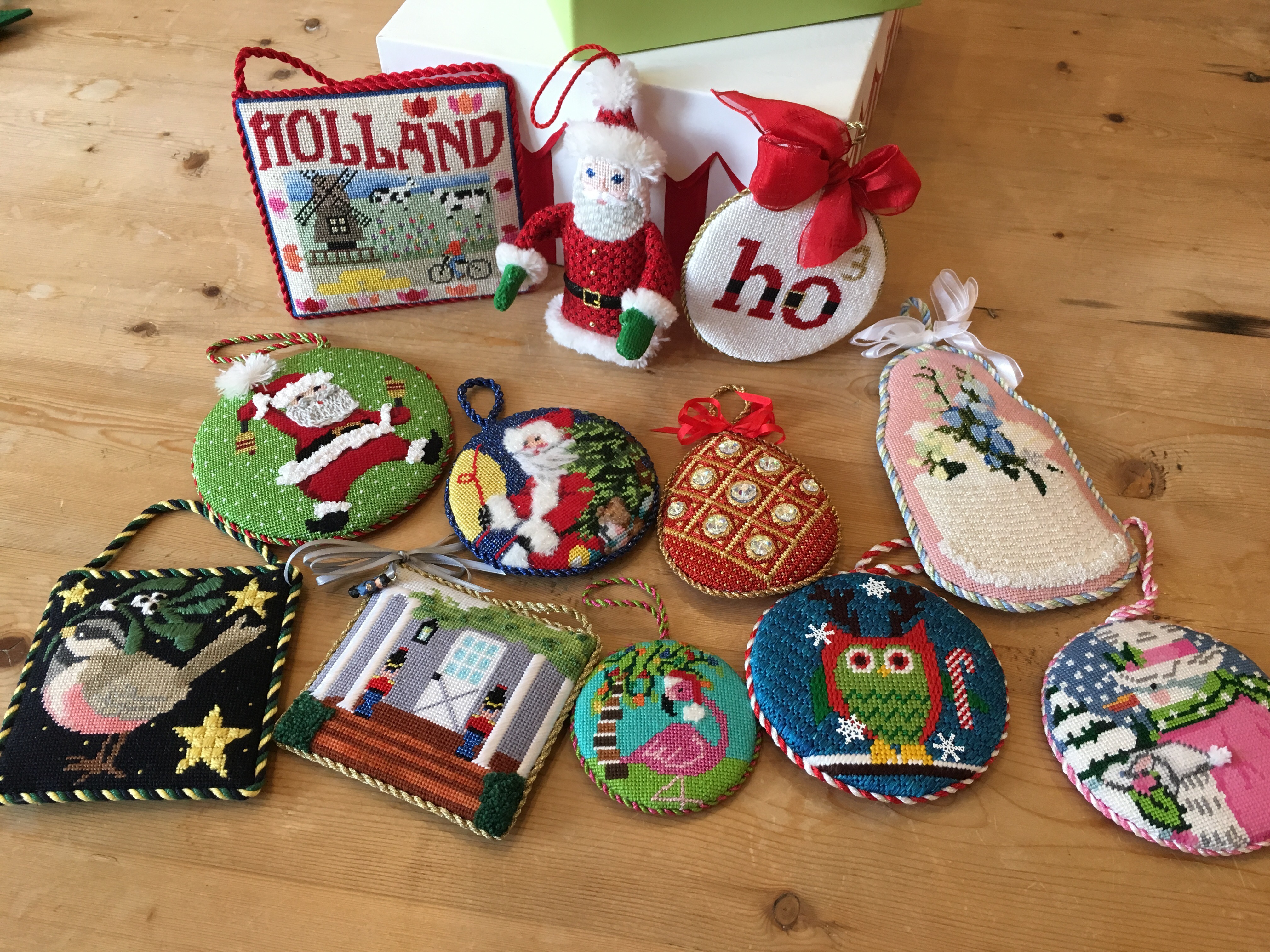 Posted: December 5, 2016 Filed under: Uncategorized Leave a commentA few years ago I was honored to be invited into a group of stitchers who secretly needlepoint an ornament for someone else in the group. Then as tradition holds it we get together for a lunch on this first Monday in December and exchange our lovingly stitched pieces. It is one of the highlights of my Christmas season.