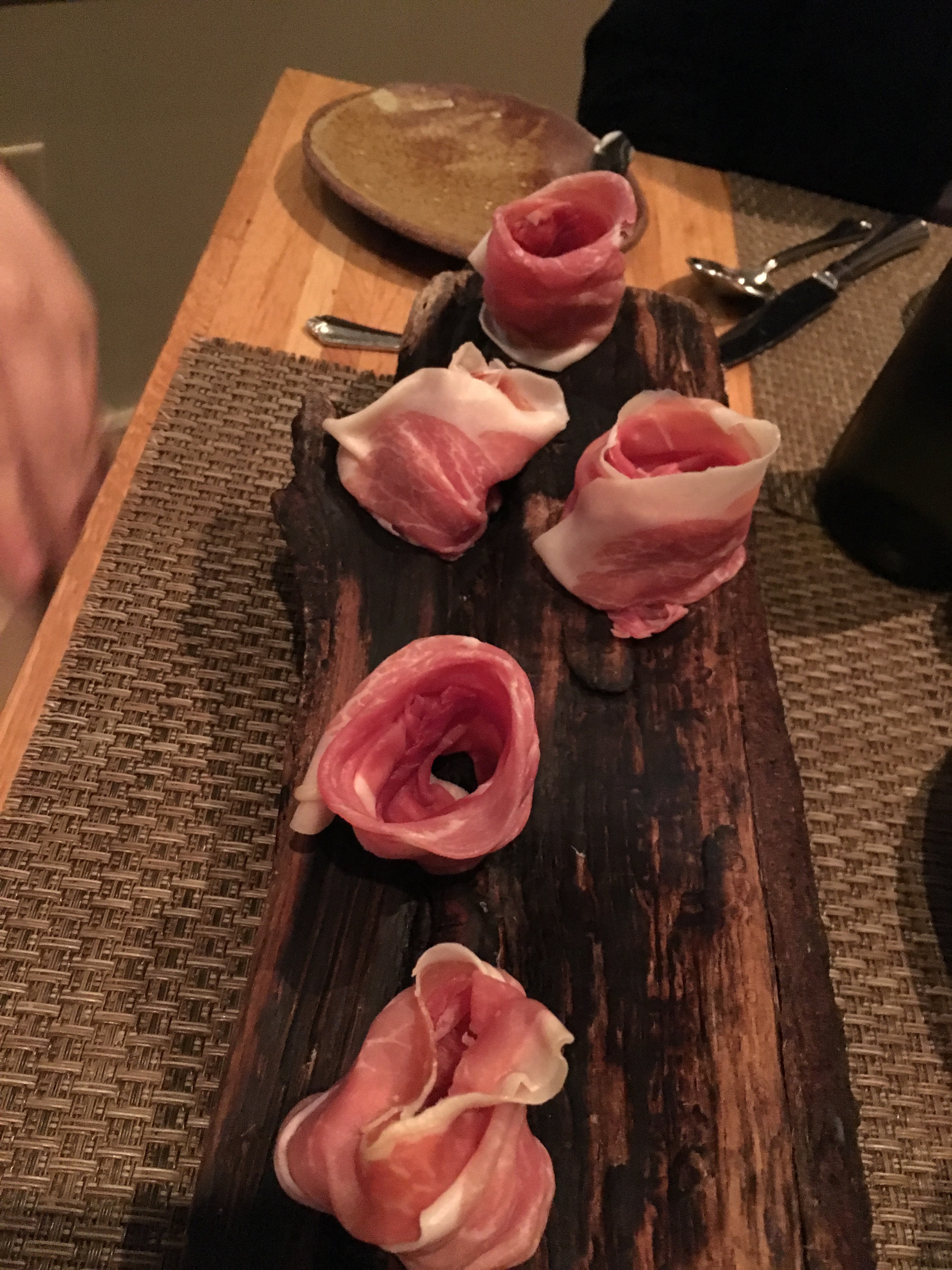 Fine dining is something we Lange’s are varsity on. Carter got the best thing, an appetizer that was a deconstructed ham biscuit. It was a few pieces of Country ham served rolled up on a charred log. Carter said how could you go wrong with meat on a log.