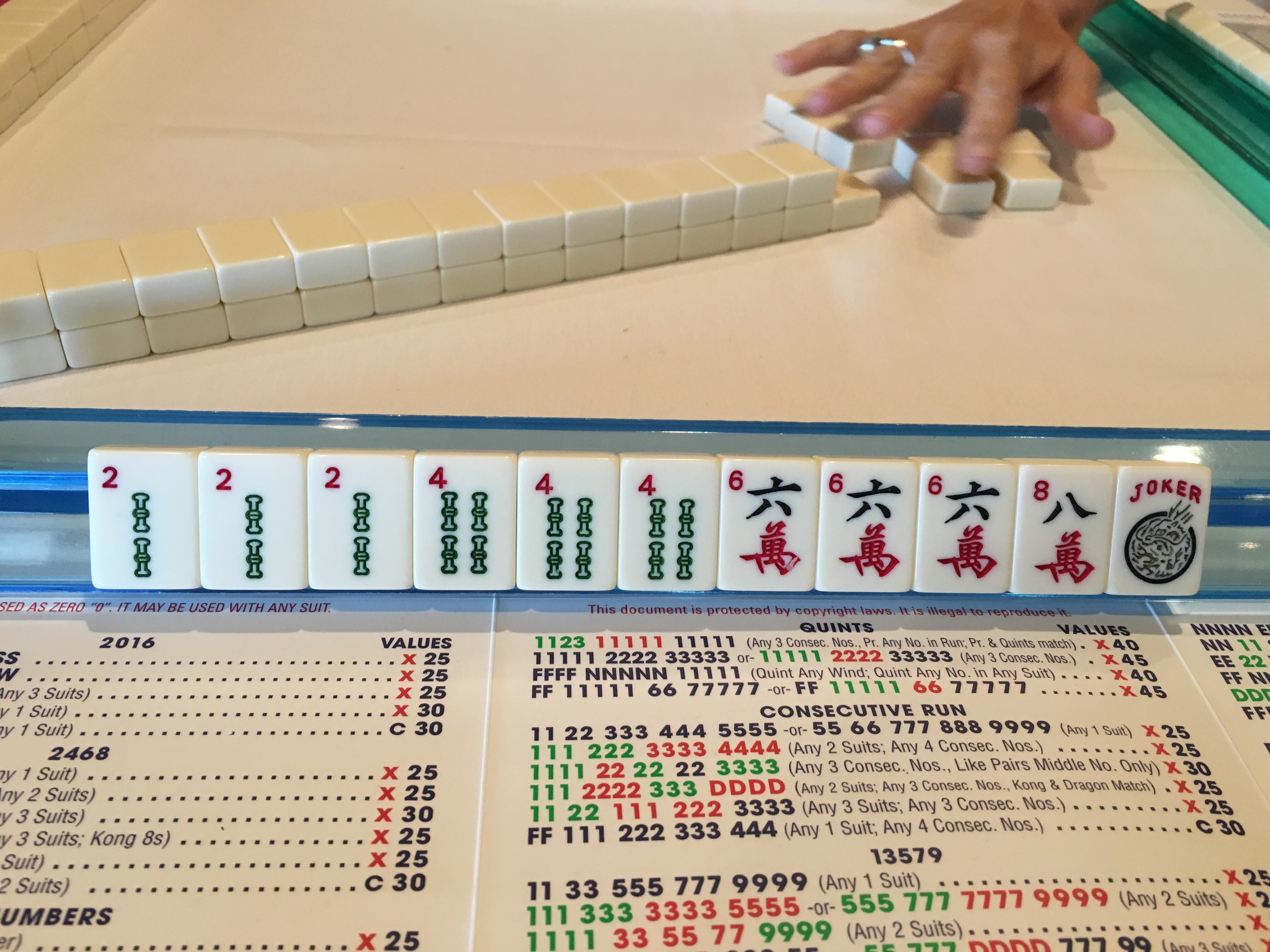 I had not made a lesson plan because I wanted to see what level they were at, but it did not take long for me to find many themes in their playing where they could step up to the next stage. I realized that some of my ideas about teaching them strategy and probability would have to wait for another lesson. It occurred to me that I probably could find things to teach people about Mah Jongg for four or five lessons. Not that there are that many people looking to become Mah Jongg life masters, a designation that does not exist. Or should it?