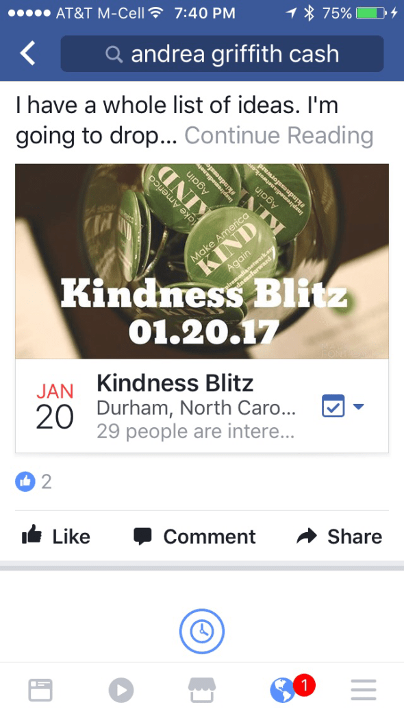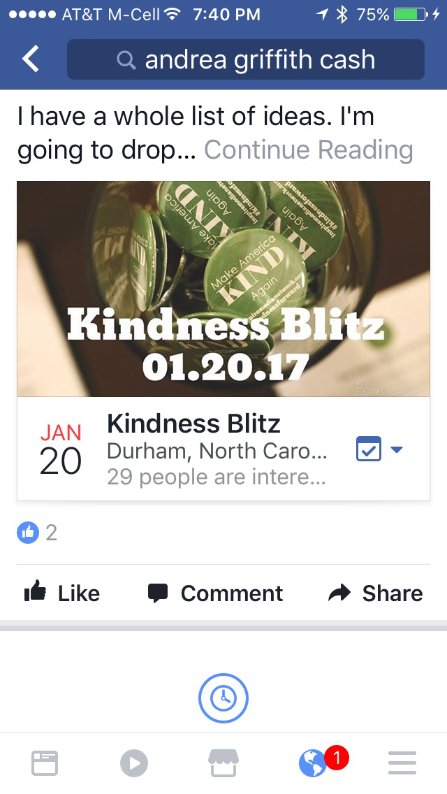 Posted: January 9, 2017 Filed under: Uncategorized Leave a commentToday my friend Andrea Griffith Cash started what she is calling a Kindness Blitz to do on January 20. This is what she posted: