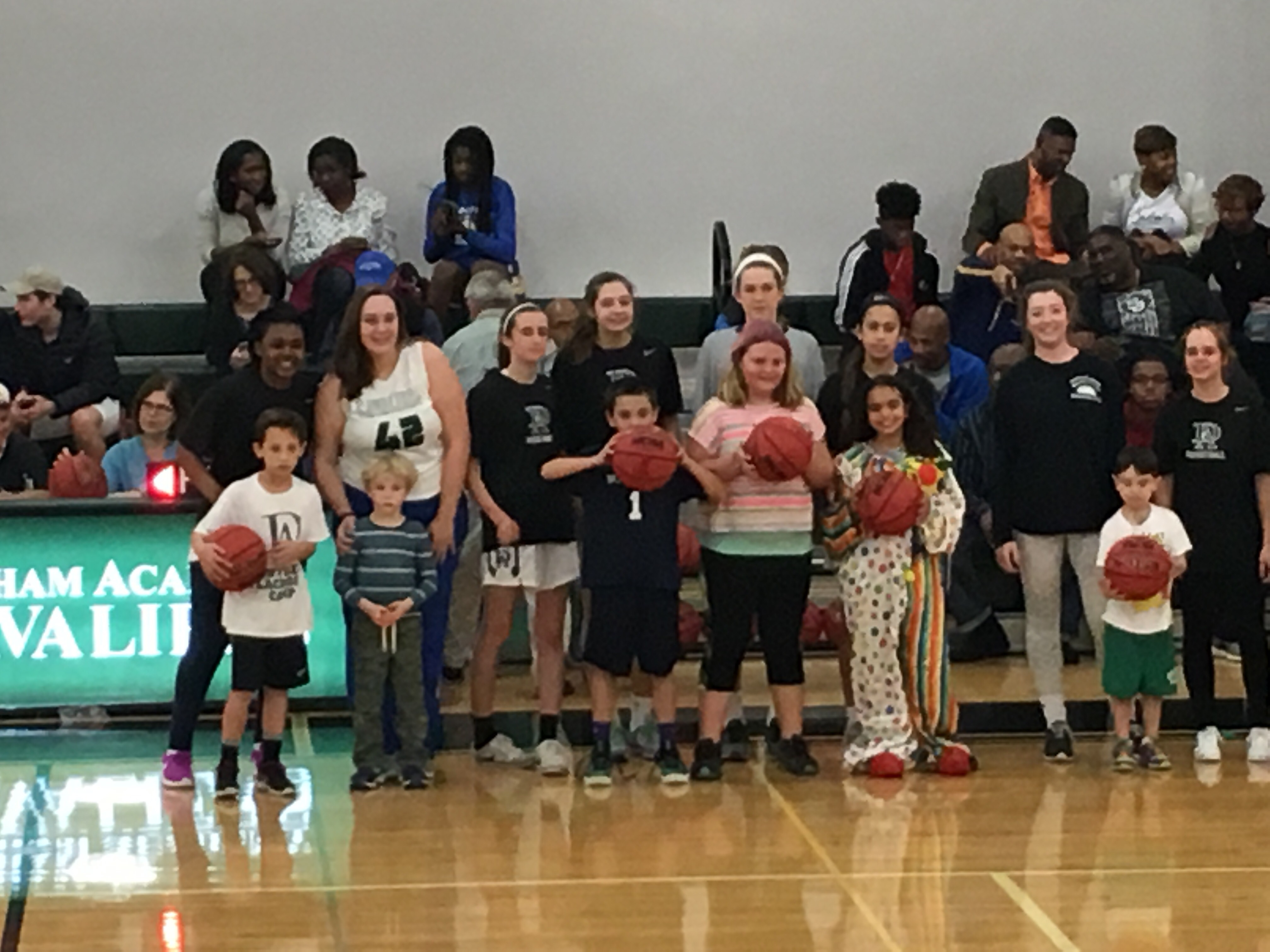 They came out and took a commanding lead which they held for the whole game finished 63-29. The varsity girls were in charge of the half-time child friendly basketball musical chairs during the half of the Varsity boys game. Children’s name’s were called to come down the the center of the court and get paired up with a big girl. Carter got a kindergarten boy who was a little nervous about coming out to play with such a tall girl. She coaxed him into the circle by giving him the basketball.