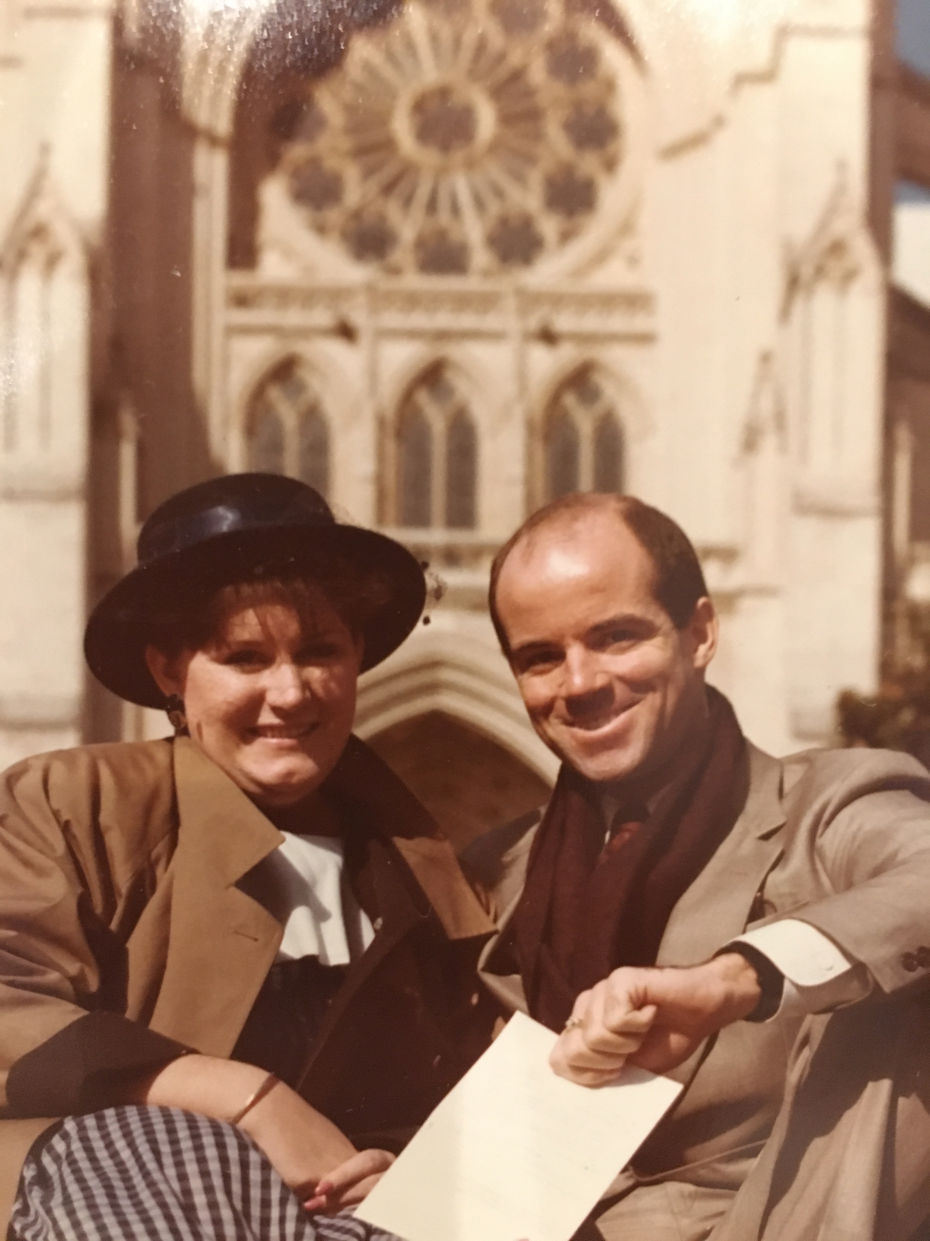When Carter got home she wanted to look at old pictures of my Washington days. Since both David and I were usually the photographer, most of the pictures have either, but not both of us in the shot. I did find this one picture of us from an Easter visit to the Cathedral. That has to be the explanation for my hat. It also was the early eighties so there is no accounting for the outfits.