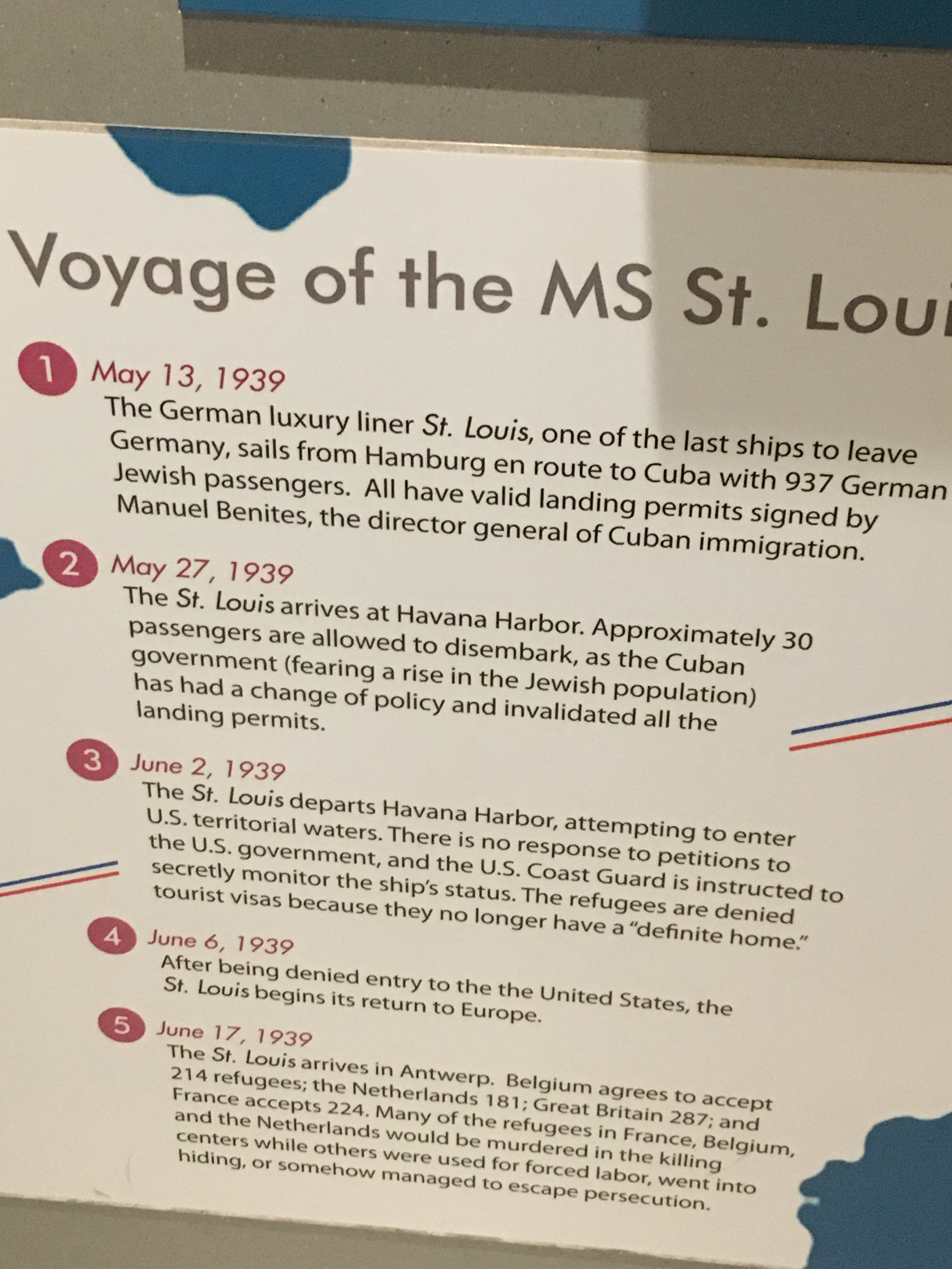 One thing I learned about that I never knew was about the ship the MS St. Louis. In May of 1939 it left Germany for Cuba with 937 Jewish passengers. They were denied entry into Cuba, denied entry into the US and sailed back to Belgium. They were at sea for over a month and the U.K., Belgium, the Netherlands and France divide them up as refugees. Except for the ones who went to the U.K., most were murdered in the concentration camps. They so easily could have been saved if the US had just accepted them as refugees. Are we repeating history right now?