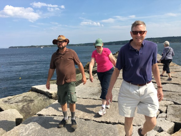 Posted: July 23, 2017 Filed under: Uncategorized 1 CommentThis morning Russ announced that is was so hot in Durham that it was reported to feel like it was 115°. Thank goodness it was only 62° here first thing in the morning with a perfectly blue sky. With the down right chilly morning it was perfect to get in as many steps as we could. Russ set off ahead of Warren and I and walked to the break water so he could get in his weekly call to his Dad while walking.