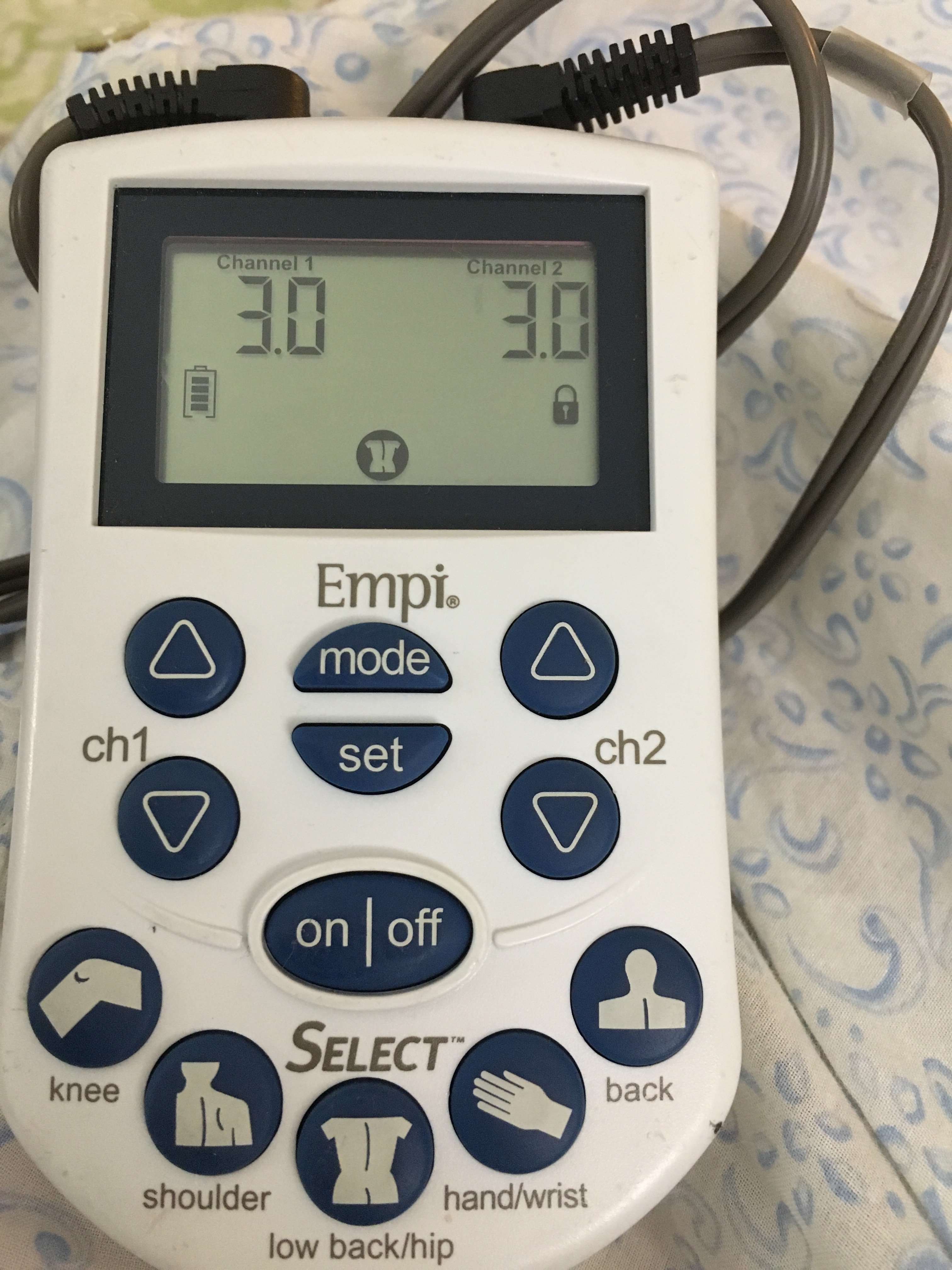 Tonight Russ, Carter and I had our last dinner together before she leaves in the morning to go to Cheerio to work for the next six weeks. My back was hurting more than ever. I think the stress of her leaving was adding to the pain. I needed to do something to change the situation. I remembered that Carter had a Tens machine we got for her knee rehab after her meniscus surgery.