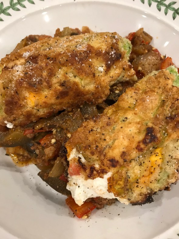 Since I shop without lists or recipes, instead, just buying what looks good, I often find I am putting together foods in new and interesting ways. Last night’s dinner is a prime example. I have picked up chorizo, eggplant, tomatoes, red Carmen peppers, squash blossoms and some soft cows milk cheese from Boxcar cheese that was pimento flavor.
