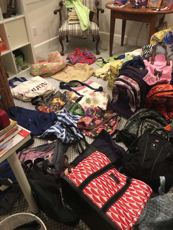 I carefully unloaded the closet. Making the already cluttered room even worse. I lay all the bags out of the floor and texted Carter a photo asking her which ones she really wanted to keep. Thankfully she picked out less than 5% and said I could give away the rest. There must have been ten string backpacks from places she went as long as thirteen years ago.