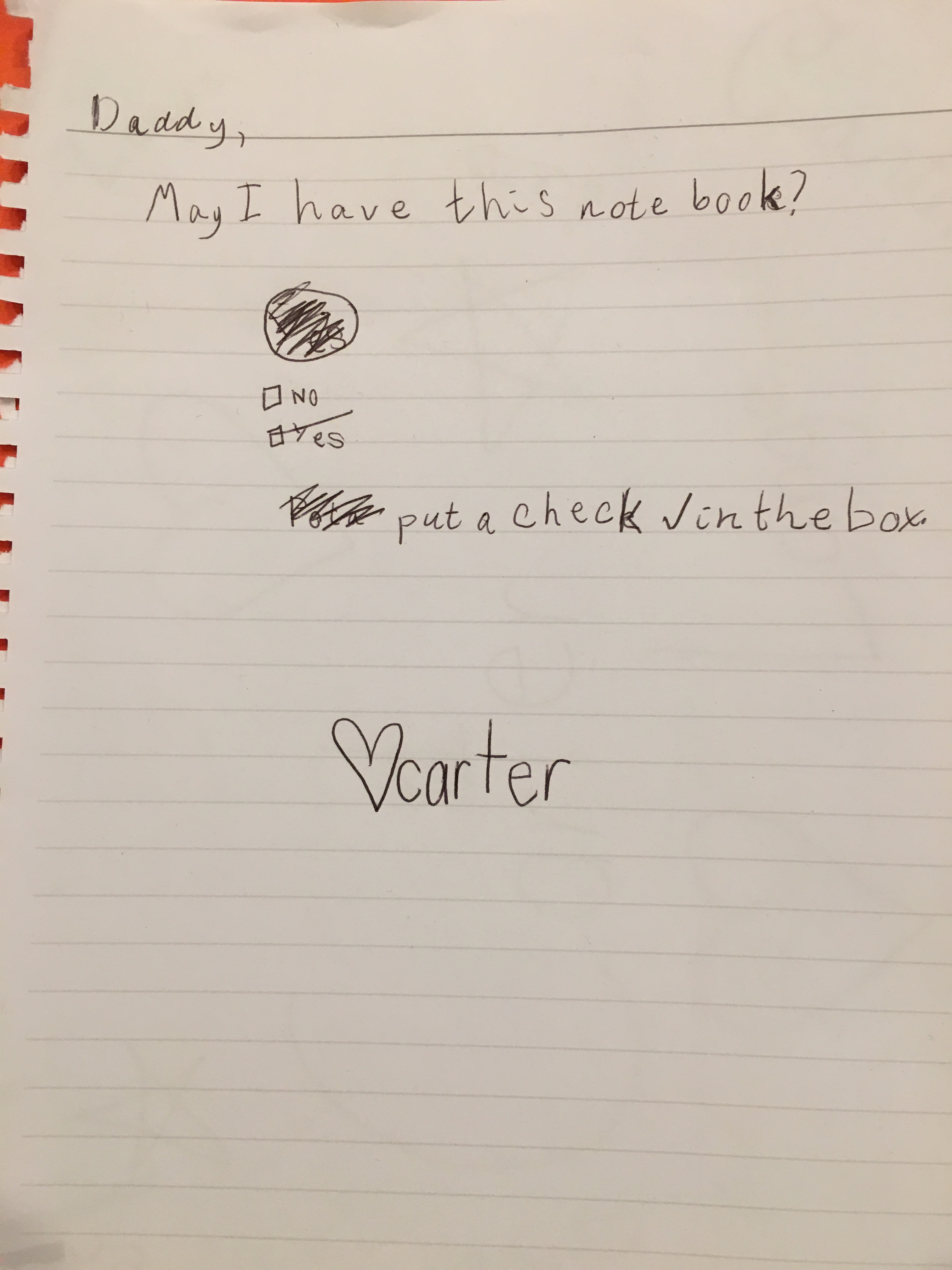 I now have an entire office supply store of notebooks, pads, paper, note cards and all other things office related. This is a genetic thing Carter got from me. A favorite note was one I found asking her father if she could have one of his notebooks. I can’t imagine she actually needed it, just wanted it.