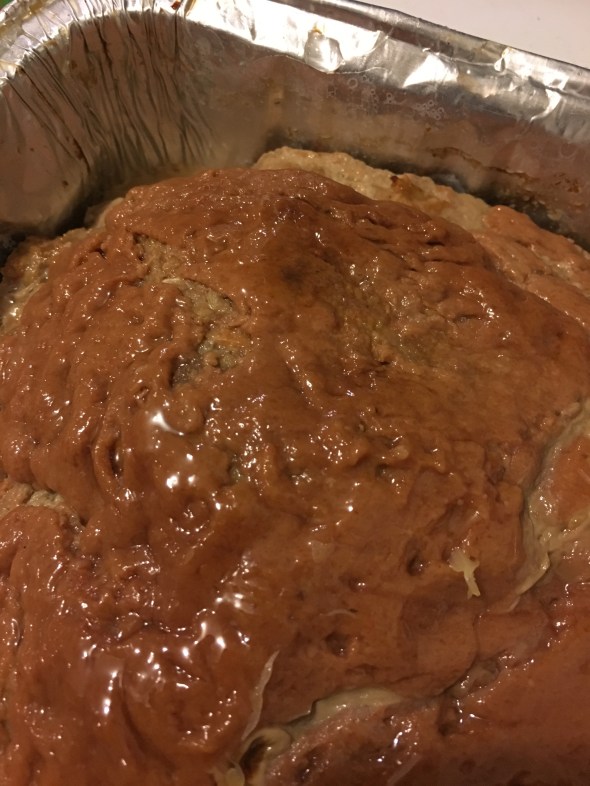 Mix the sauce together and after the meatloaf has baked for 45 mins, spread the sauce over the top and put back in the oven for another 30 mins.
