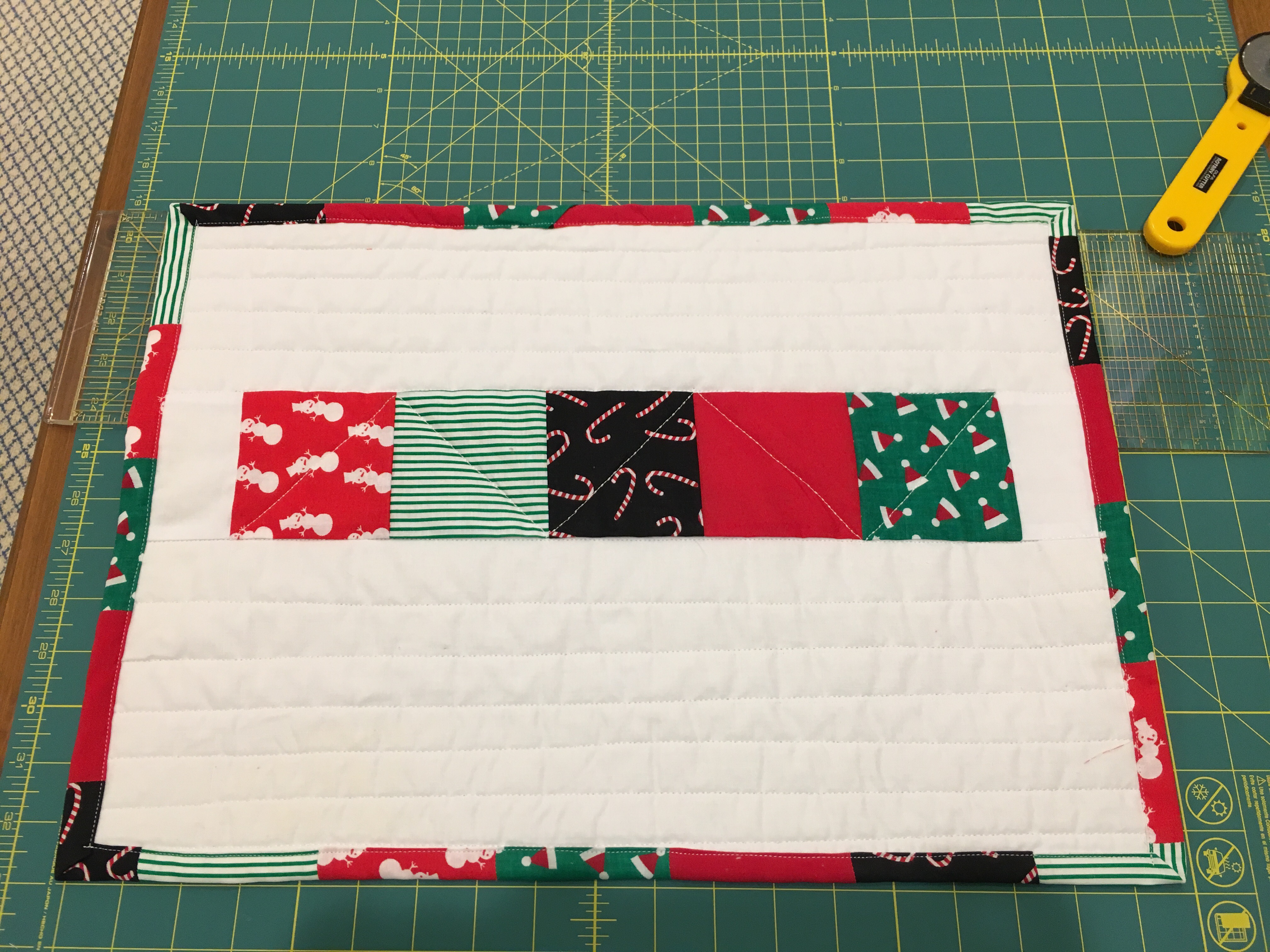 Since I have started quilting in earnest I have been teaching myself how to do it. Quilting is a precision activity I have discovered. I have become more adept at making the quilt tops, but I wanted to try my hand at the actual quilting, that is making the sandwich of pieced top, batting and backing. Since I don’t own a sewing machine that is made to do that kind of quilting I needed to make something small. I decided that Christmas placemat might be a good way to experiment.